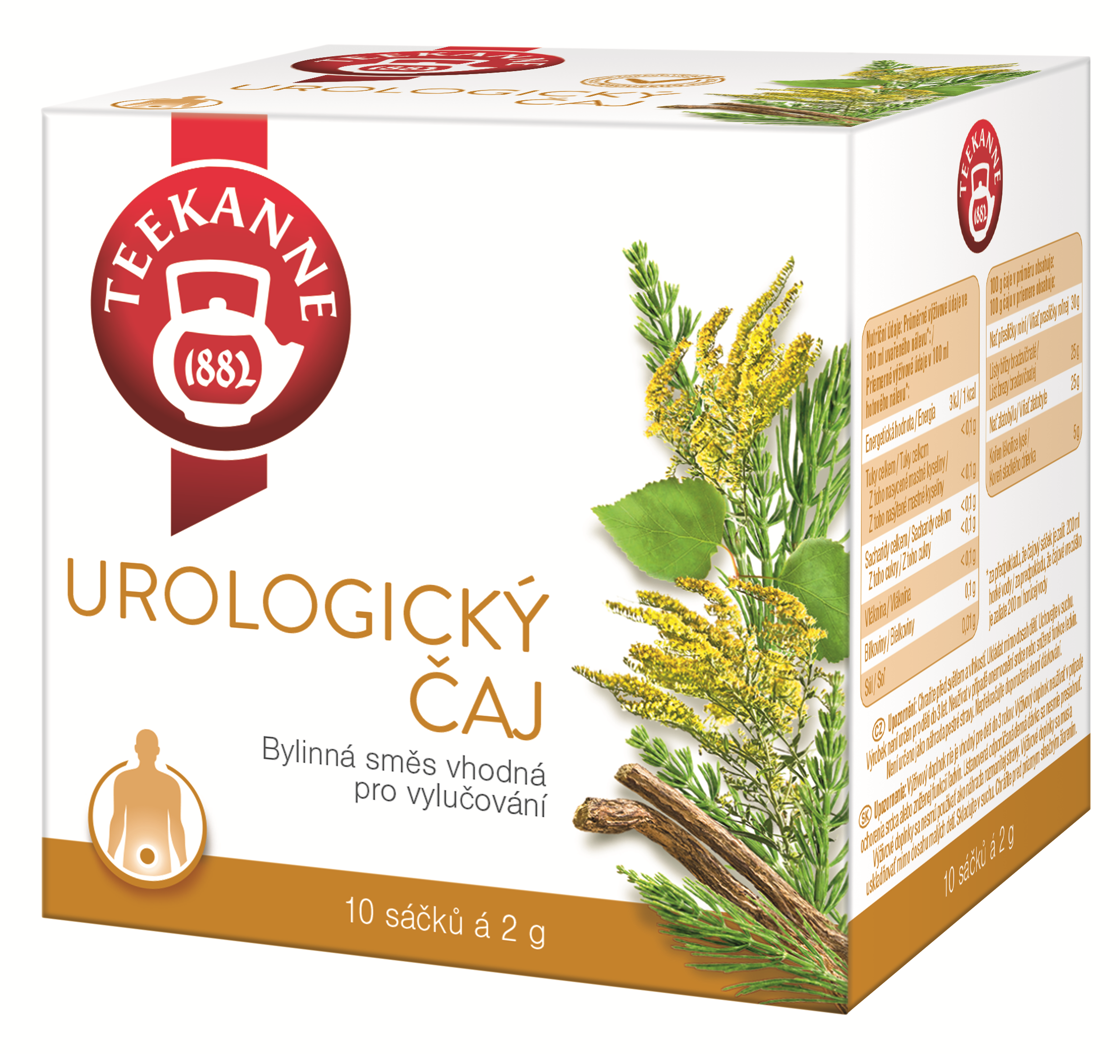 Urologický čaj. Hlavní složky bylinné směsi jsou: Kořen jehlice trnité pro normální funkci močových cest, podporuje vylučovací schopnost ledvin. Kořen lékořice pomáhá udržovat zdraví močových cest. List břízy podporuje vylučovací funkci ledvin. Nať zlatobýlu pomáhá udržovat zdravý močový měchýř a přispívá k jeho normální funkci. Posouzeno státním zdravotním ústavem.