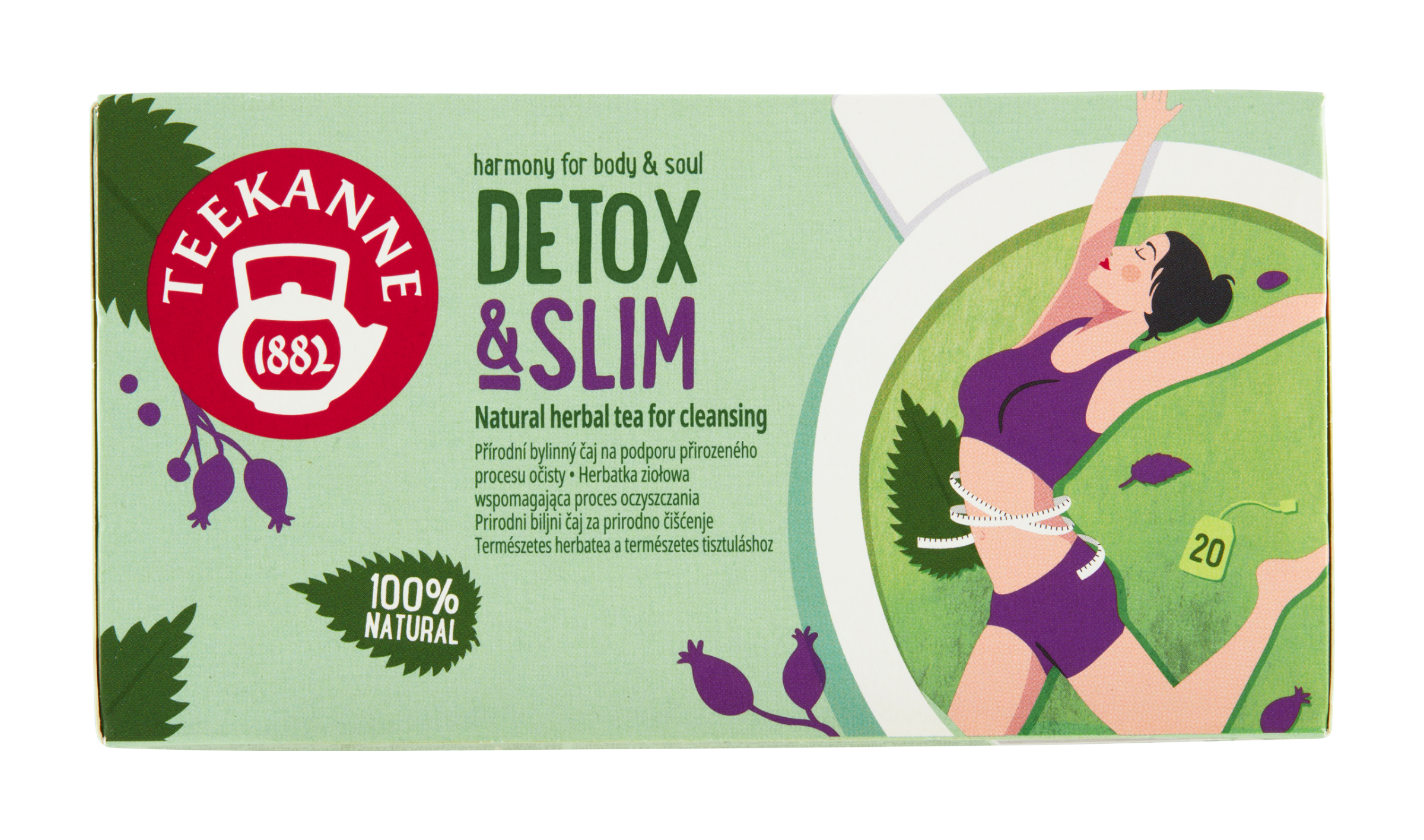 Teekanne Detox & Slim je uklidňující bylinný čaj, s čajem zeleným, který napomáhá přirozenému procesu očisty a je ideálním společníkem při půstu, nebo když se snažíte snížit hmotnost. Tento čaj, silná kombinace zeleného čaje a kopřivy, podporuje přirozenou očistu. Kopřiva podporuje vylučovací schopnost ledvin. Obsahové látky zeleného čaje (katechiny) pomáhají zabránit hromadění tuků v těle. Zelený čaj rovněž pomáhá vylučování vody z těla. Čaj navíc podporuje zdravé stravování a psychickou pohodu, rozmanitě pokrývá každodenní požadavky na pitný režim, neobsahuje cukr a nemá v podstatě žádné kalorie. Získejte dobrý pocit v těle a užijte si šálek po šálku.
