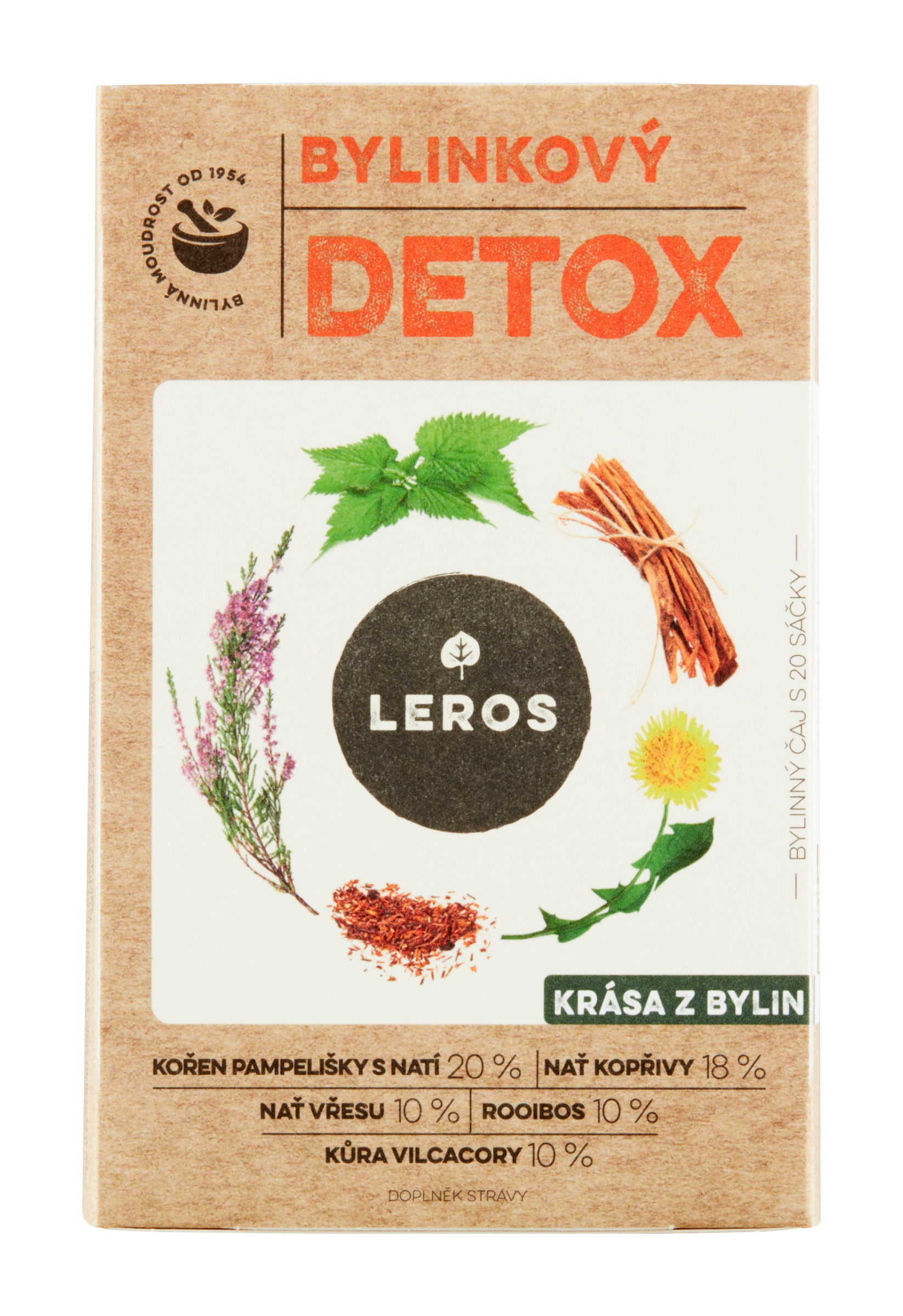 Bylinná směs s pampeliškou a kopřivou, které pomáhají k detoxikaci Vašeho organismu. Bylinky pro očistu organismu Bylinná směs s vilcacorou a kopřivou, které podpoří Váš imunitní systém. Smetanka, máta a skořice přispějí ke správnému trávení a kopřiva s vřesem k plynulému vylučování škodlivých látek z těla. Vilcacora je dřevnatá liána, která pochází z amazonských deštných pralesů, tamní Indiáni ji uctívali pro její léčivé vlastnosti. Čas na sebe Vyberte si hrníček, který potěší Vaše oči. Vložte do něj čajový sáček s bylinkami. Zalijte jej horkou vodou. Zavřete oči a 10 minut myslete na čistotu, kterou tento čaj Vašemu tělu přináší. Poté si pomalu, v klidu vychutnávejte každý doušek tohoto lahodného čaje. Chuť & vůně čaje Ve vůni čaje dominuje příjemná kořeněná skořice. Barva čaje vyniká zlatavými a červenými tóny, které dodává přídavek rooibosu. Chuť čaje není příliš výrazná, ucítíte v ní hlavně rooibos doplněný kopřivou a jemnou svěžestí vřesu.