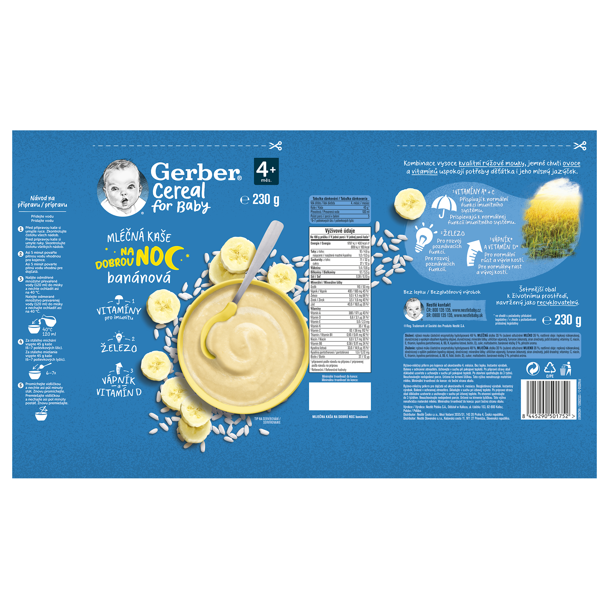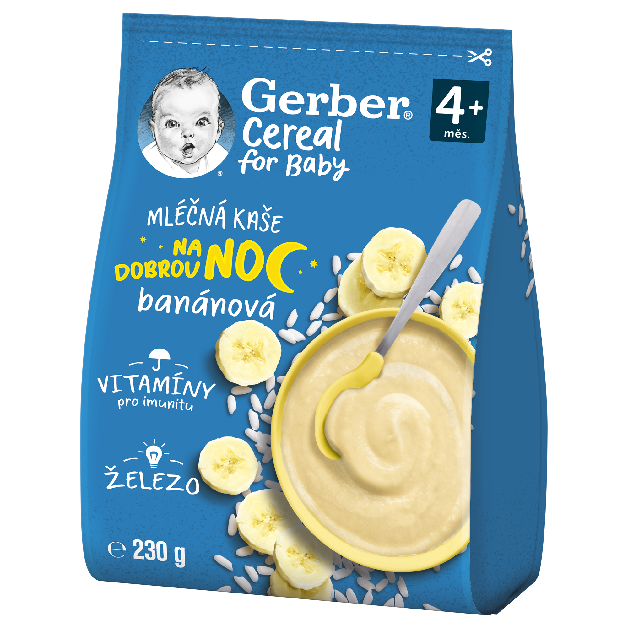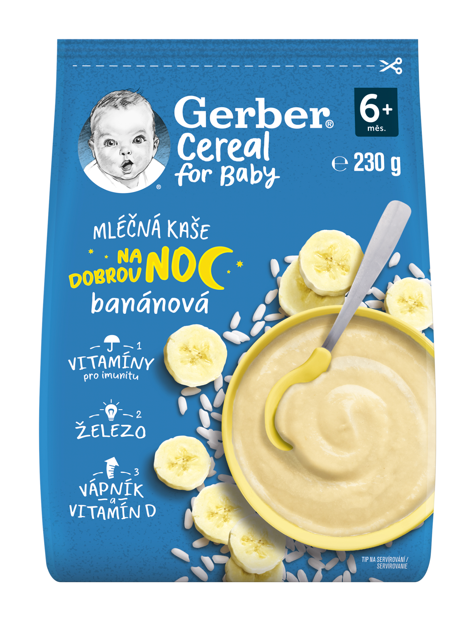 GERBER Cereal mléčná kaše banánová Dobrou noc je kombinací vysoce kvalitní rýžové mouky, jemné chuti banánu a vitamínů, která uspokojí potřeby děťátka i jeho mlsný jazýček. Neobsahuje lepek, tudíž je vhodným začátkem pro každé malé bříško v době prvních příkrmů. Kaše je vhodná pro kojence od ukončeného 6. měsíce. Miska plná dobrot obsahuje rýžovou mouku, 11 vitamínů a minerální látky pro správný rozvoj dětského organismu. Každá miska podpoří růst a vývin kostí, normální funkci imunitního systému a rozvoj poznávacích funkcí vašeho děťátka. Kaše GERBER Cereal Dobrou noc kombinují vysoké nároky na kvalitu pečlivě vybrané rýže a jemnou chuť ovoce pro potěšení všech malých bříšek. Obal je šetrnější k životnímu prostředí, navržený jako recyklovatelný.
