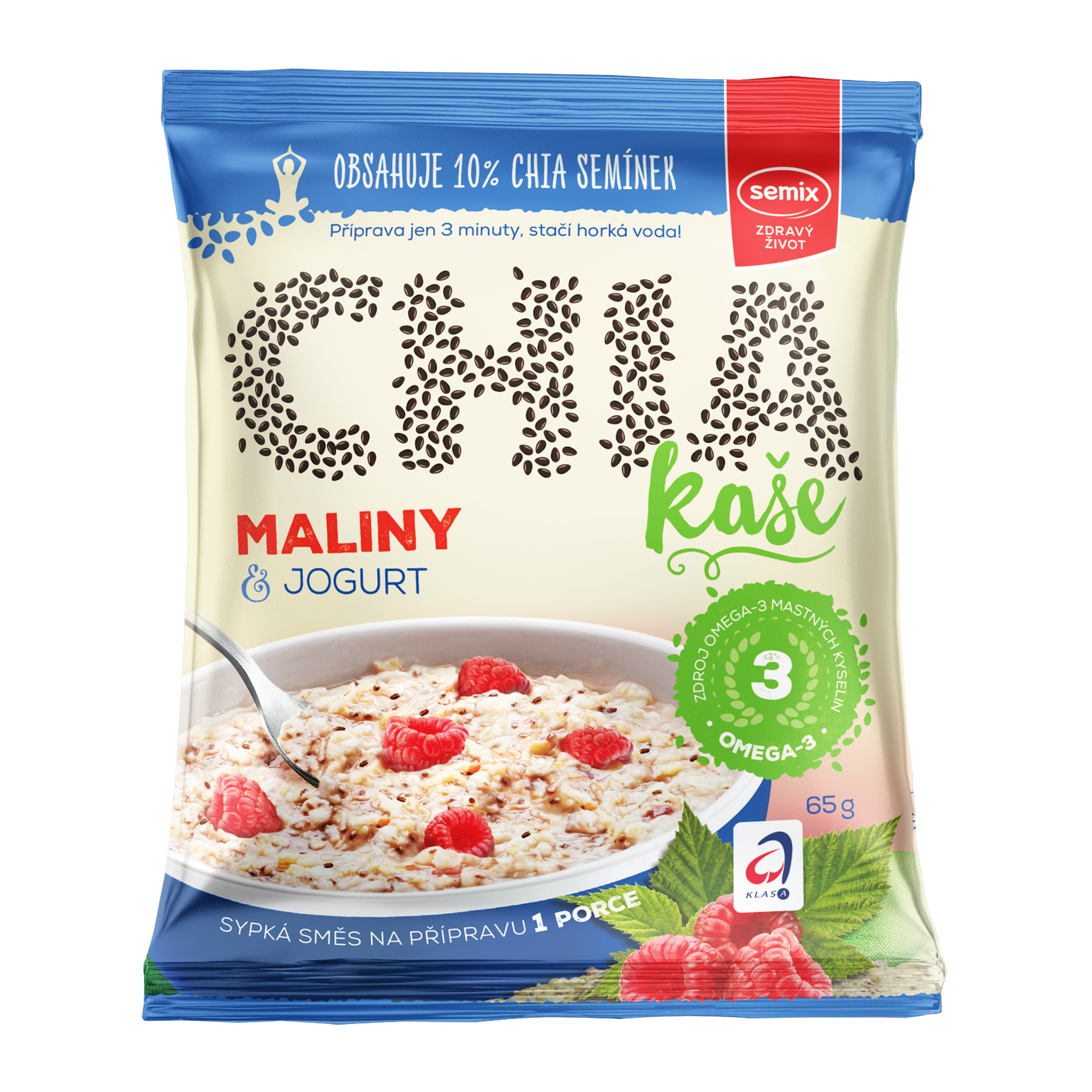 Jedinečná kaše, která se nevaří, je díky chia semínkům zdrojem omega-3 mastných kyselin a obsahuje 6,5 g vlákniny na jednu porci (65 g)! Obsahuje ve 100 g 1,5 g kyseliny alfa-linolenové (z řady omega-3 mastných kyselin), která přispívá k udržení normální hladiny cholesterolu v krvi. Příznivého účinku se dosáhne při přijmu 2 g této kyseliny denně.