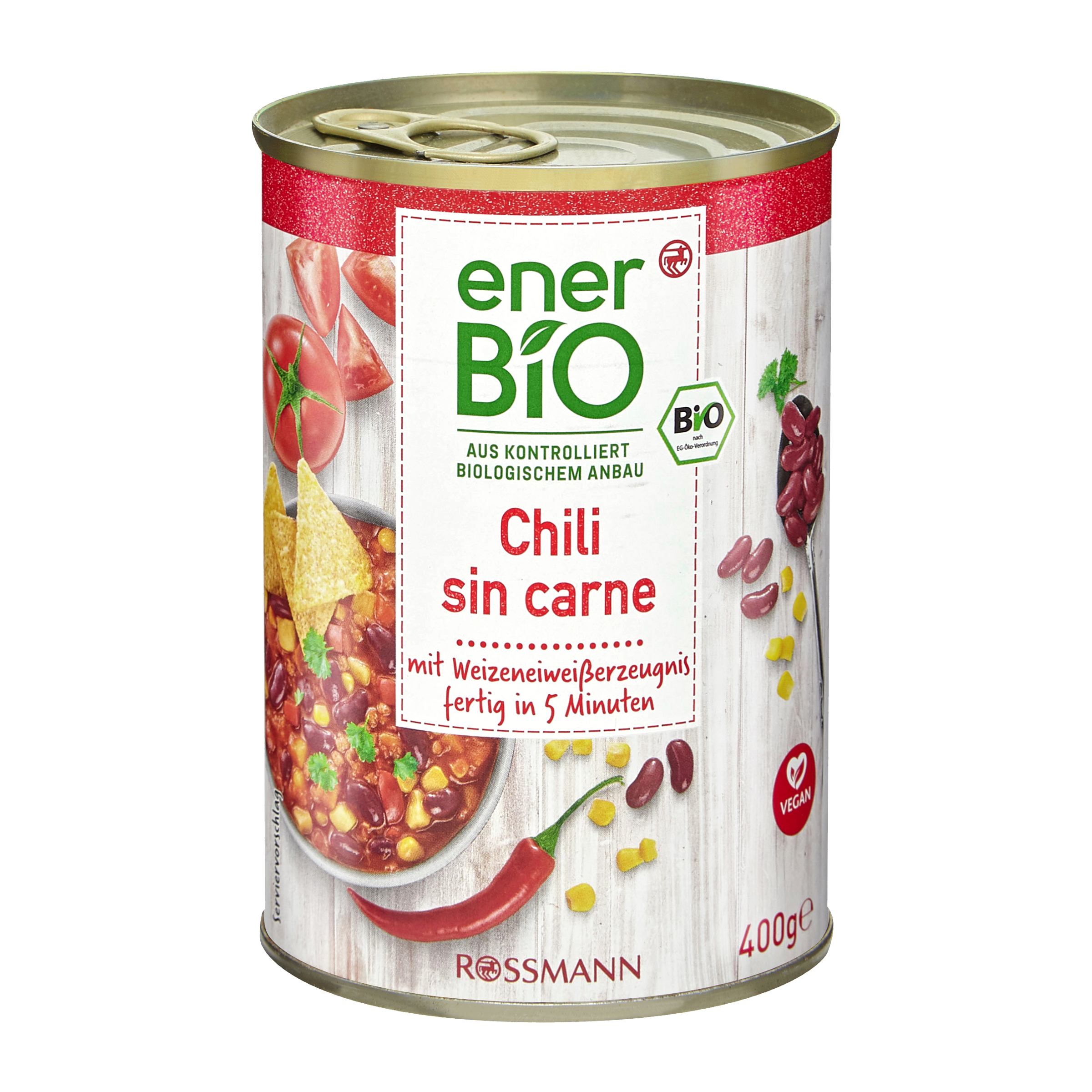 Pitná voda, červené fazole* 18 %, rajčatový protlak * 17 %, brambory*, červená paprika*, kukuřice* 5 %, mrkev*, cibule*, pšeničný bílkovinný výrobek* 3 % (PŠENIČNÍ LEPEK*, CELOZRNNÝ PŠENIČNÝ ŠROT*, PŠENIČNÉ OTRUBY*, mořská sůl), zeleninový vývar* (mořská sůl, cibule*, pór*, mrkev*, pastinák*, petržel*, kurkuma*, česnek*, muškátový ořech*, libeček*, pepř*), zahušťovadlo: guarová guma*, mořská sůl, uzená sůl (mořská sůl, bukový kouř), česnek*, koriandr*, kmín*, chilli*