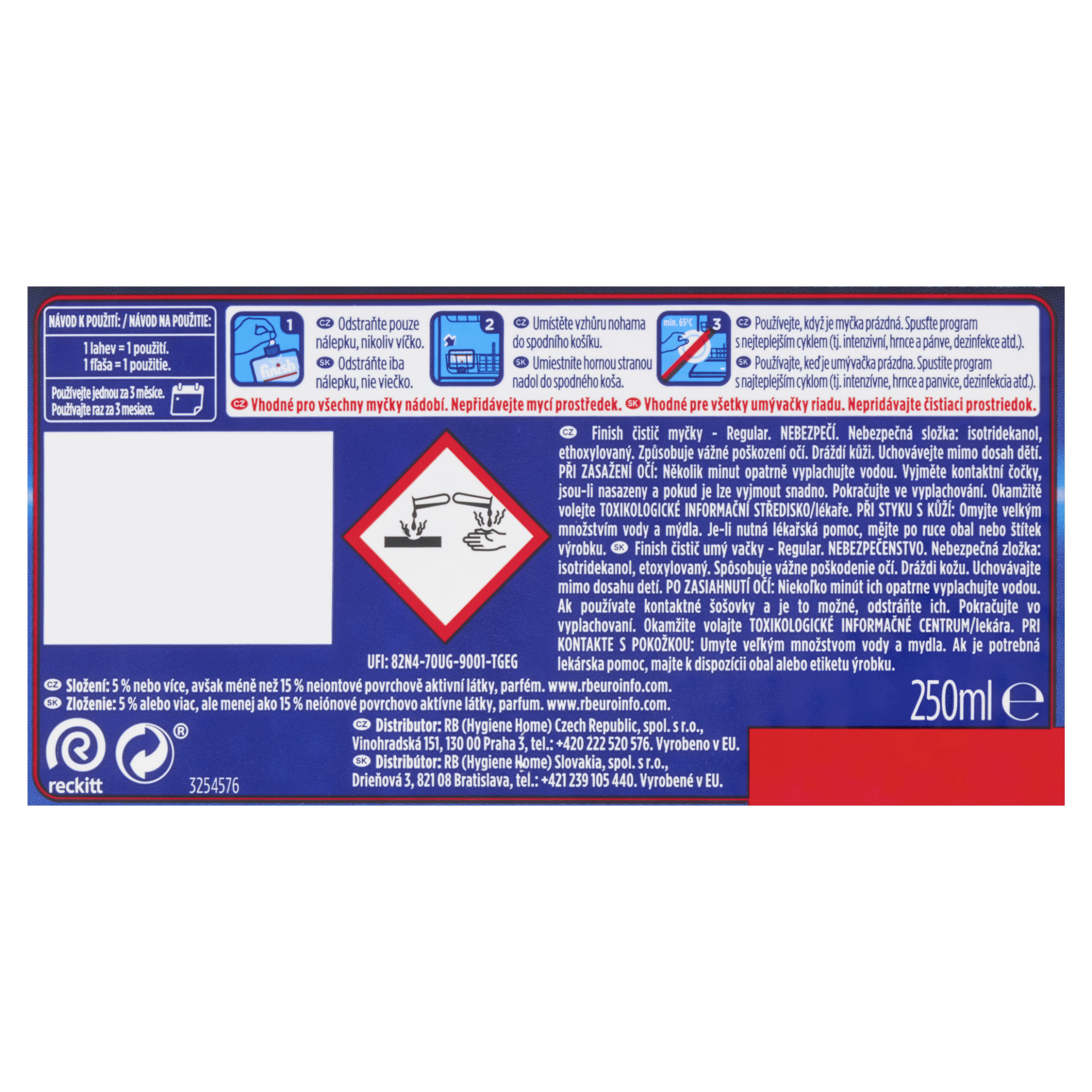 Návod k použití: 1 lahev = 1 použití. Používejte jednou za 3 měsíce. 1 Odstraňte pouze nálepku, nikoliv víčko. 2 Umístěte vzhůru nohama do spodního košíku. 3 Používejte, když je myčka prázdná. Spusťte program s nejteplejším cyklem (tj. intenzivní, hrnce a pánve, dezinfekce atd.) Vhodné pro všechny myčky nádobí. Nepřidávejte mycí prostředek.