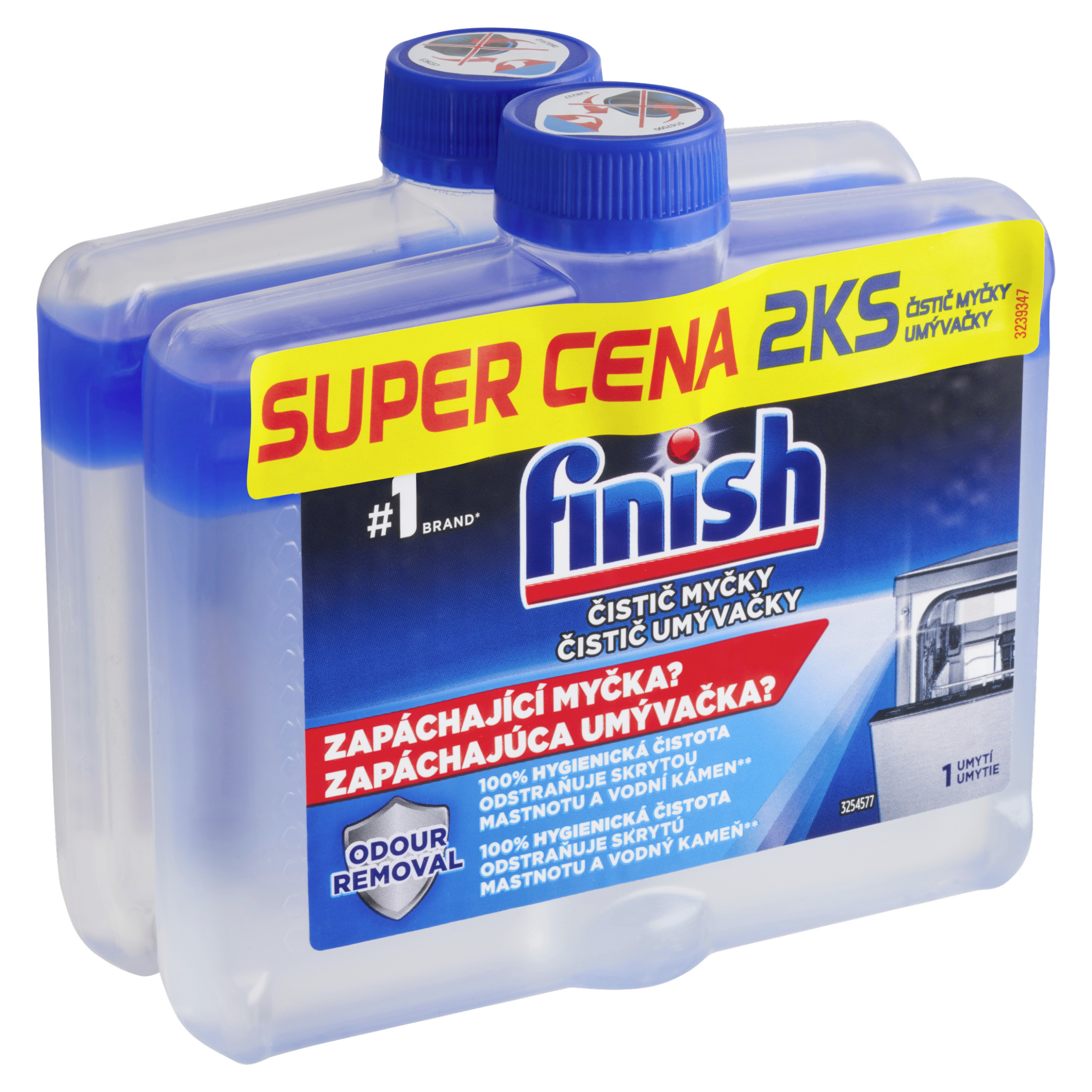 Zapáchající myčka? 100% hygienická čistota odstraňuje skrytou mastnotu a vodní kámen**. Finish čistič myčky: Díky silnému dvoufázovému složení nový Finish čistič myčky účinně odstraňuje skryté nečistoty a vodní kámen a činí tak vaší myčku o 100 % hygienicky čistější a déle svěží.** **2x efektivnější v odstranění vodního kamene z myčky v porovnání s použitím pouze detergentu Finish. Finish je nejvíce prodávanou značkou v kategorii Automatického mytí nádobí na základě hodnoty prodejů v EU (vyjma Kypru, Finska, Lucemburska a Malty) v předchozím roce. Zdroj: Nielsen.