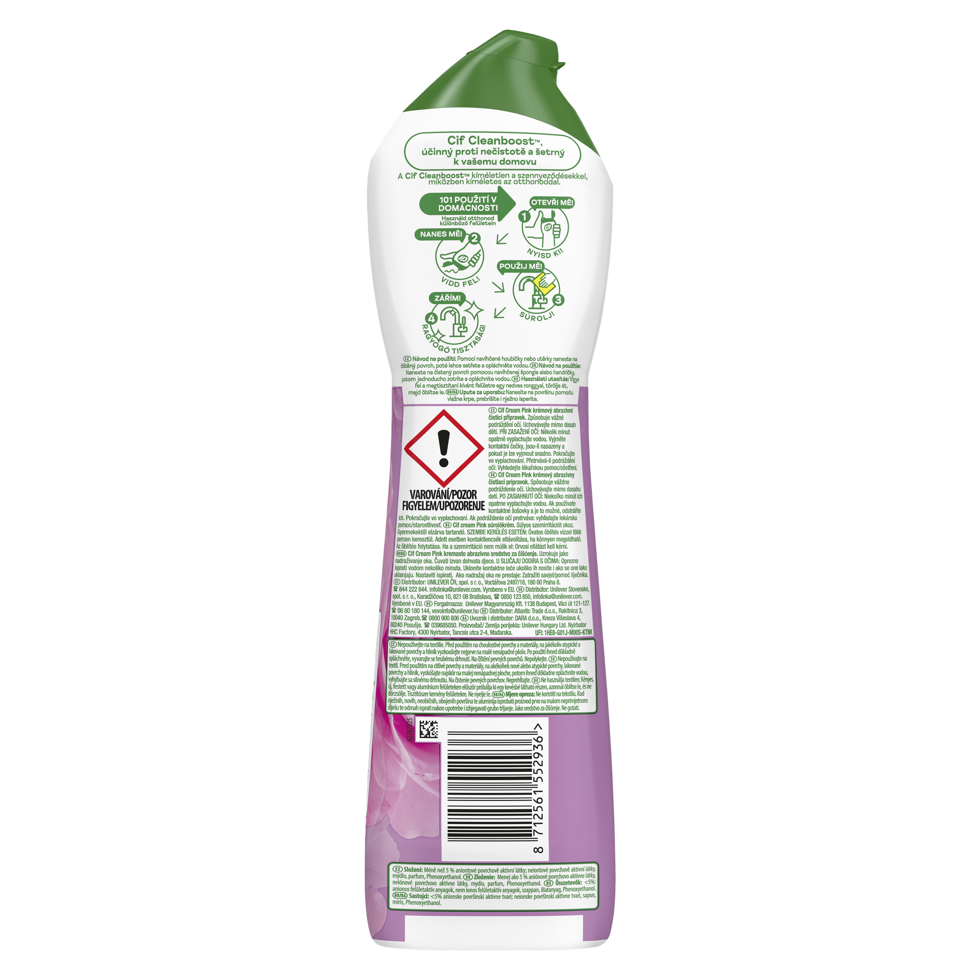 Cif Cream Pink krémový abrazivní čistící přípravek. VAROVÁNÍ Způsobuje vážné podráždění očí. Uchovávejte mimo dosah dětí. PŘI ZASAŽENÍ OČÍ: Několik minut opatrně vyplachujte vodou. Vyjměte kontaktní čočky, jsou-li nasazeny a pokud je lze vyjmout snadno. Pokračujte ve vyplachování. Přetrvává-li podráždění očí: Vyhledejte lékařskou pomoc/ošetření. Nepoužívejte na textilie. Před použitím na choulostivé povrchy a materiály, na jakékoliv atypické a lakované povrchy a hliník vyzkoušejte nejprve na malé nenápadné ploše. Po použití ihned důkladně opláchněte, vyvarujte se hrubému drhnutí. Na čištění pevných povrchů. Nepolykejte.