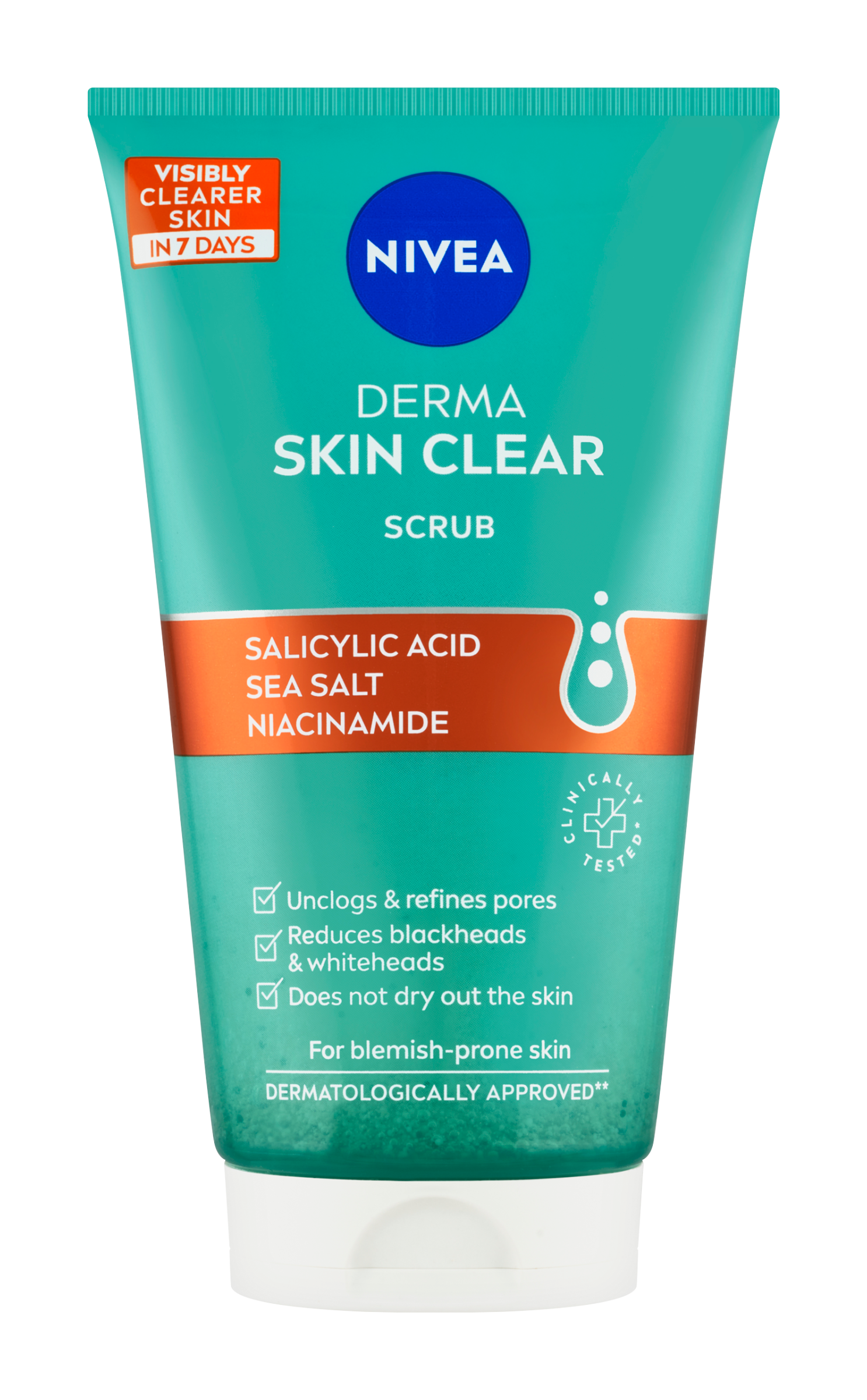 Nivea® čisticí pleťový peeling Derma Skin Clear s kyselinou salicylovou, mořskou solí a niacinamidem je speciálně vyvinutý pro pleť se sklonem k nedokonalostem. Lze použít na tvář i tělo.