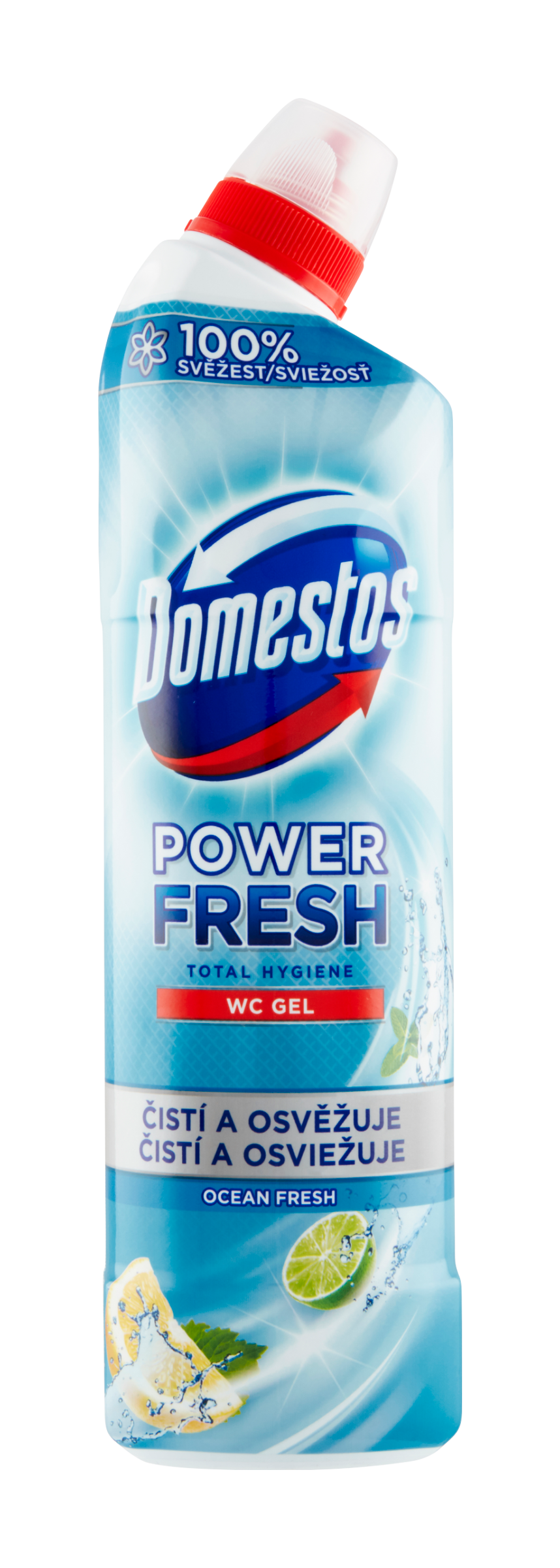 Zabíjí 99,9 % bakterií a virů. Domestos Total Hygiene Ocean Fresh je gelový dezinfekční přípravek určený k odstraňování vodního kamene v toaletě. Přilne k povrchu toaletní mísy, kde působí dlouhou dobu, a to dokonce i pod vodní hladinou!