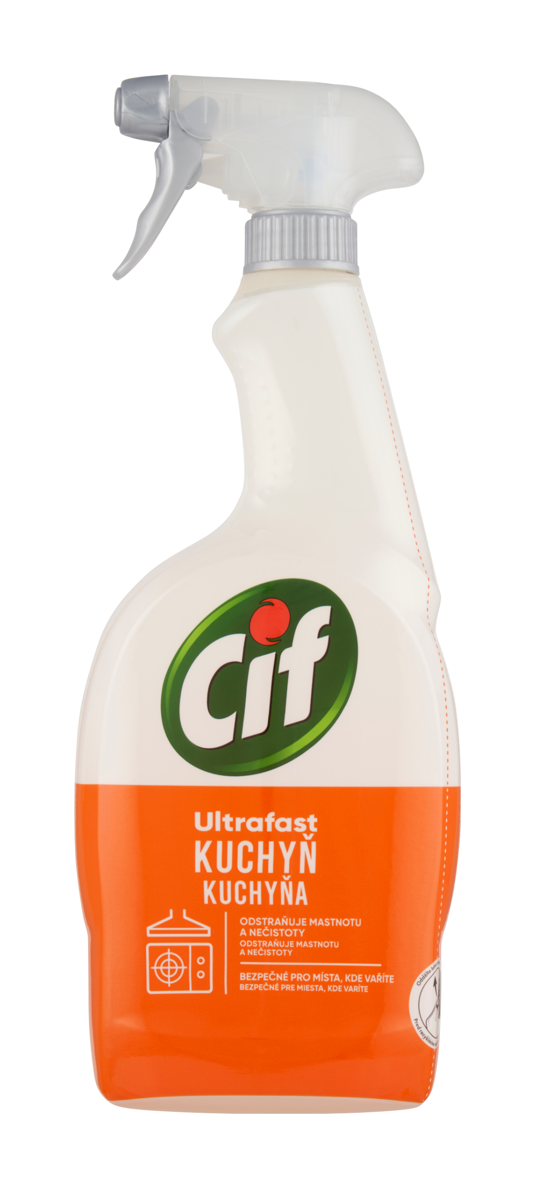 Cif Kuchyň Ultrafast čisticí sprej. Způsobuje vážné podráždění očí. Uchovávejte mimo dosah dětí. PŘI ZASAŽENÍ OČÍ: Několik minut opatrně vyplachujte vodou. Vyjměte kontaktní čočky, jsou-li nasazeny a pokud je lze vyjmout snadno. Pokračujte ve vyplachování. Přetrvává-li podráždění očí: Vyhledejte lékařskou pomoc/ošetření. Upozornění: Nepoužívejte na lakované nebo dřevěné povrchy, eloxovaný hliník, přírodní linoleum a neošetřený kámen. Po použití na mramorované povrchy, přírodní kameny, lakované kovy nebo sklokeramiku dobře opláchněte. Vždy používejte na chladných površích. Nepoužívejte na nápisy a symboly na spotřebičích, vždy se řiďte pokyny pro péči o vaše zařízení a povrchy. Před použitím na nové nebo atypické povrchy vyzkoušejte nejprve na malé nenápadné ploše.