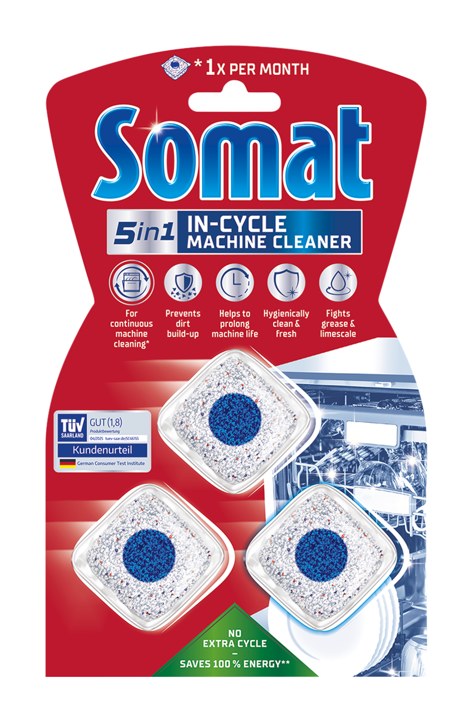 Přejděte na čistič myčky, který můžete používat během běžného mycího cyklu abyste ušetřili vodu a energii. Položte ho na dno plné myčky a zapněte mycí cyklus. Naše výkonné tablety poskytují hloubkovou čistotu, působí proti vodnímu kameni a mastnotám. Pravidelné čistění vaší myčky ulehčuje její údržbu. Používejte Somat čistič myčky jednou měsíčně. Použití: 1. Vložte nádobí do myčky jako obvykle. 2. Nadávkujte mycí prostředek do odpovídající přihrádky. 3. Vybalte tabletu Somat čističe z kartonu a položte ji ve voděrozpustné fólii na dno plné myčky. 4. Spusťte vybraný program mytí. Nepoužívejte, pokud jsou v myčce stříbrné příbory.