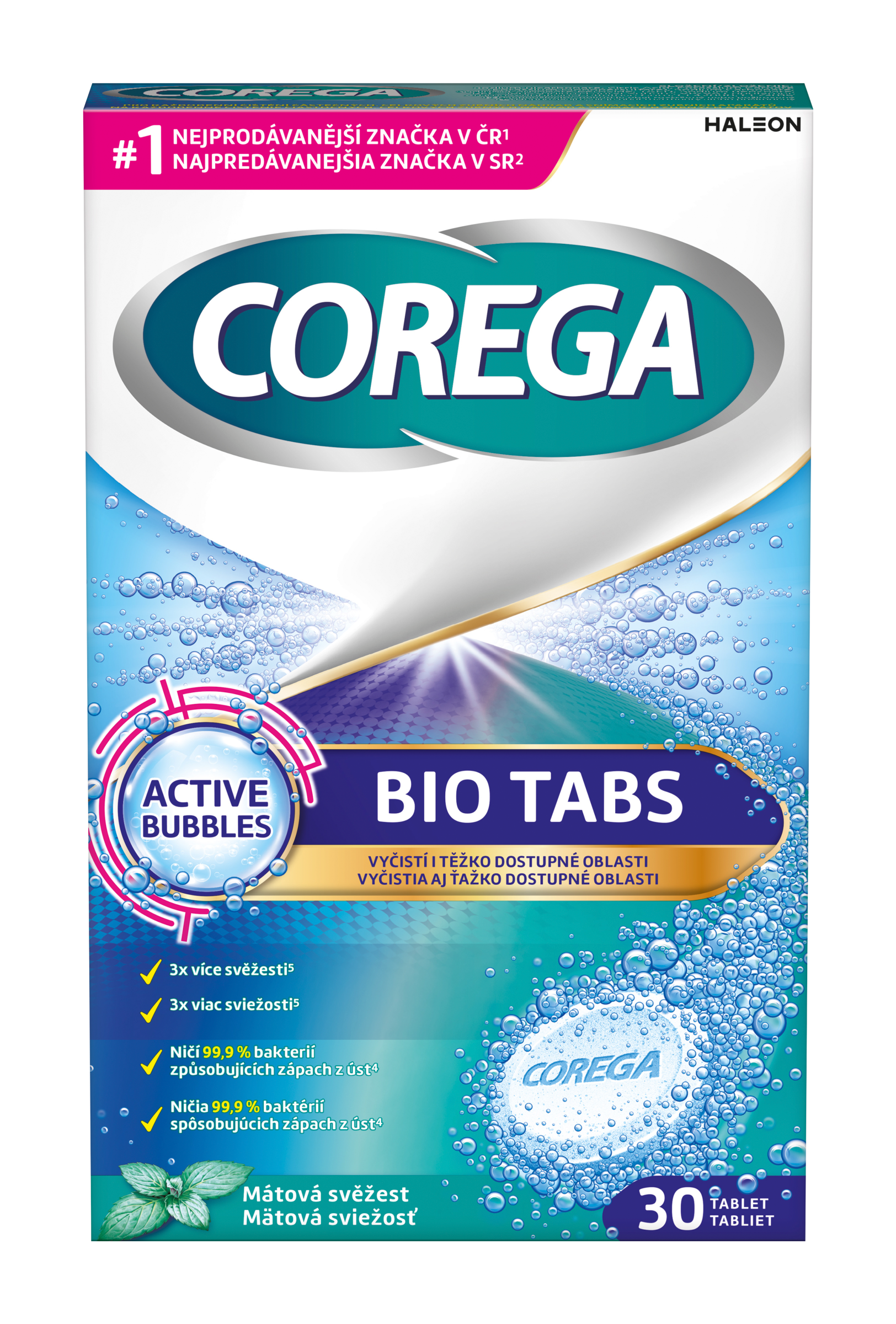 Čisticí tablety Corega s aktivními bublinkami udržují zubní náhradu čistou a svěží! Čisticí tablety Corega s aktivními bublinkami pro každodenní čištění zubních náhrad vyčistí i těžko dostupné oblasti. Každá tableta Corega je vyrobena ze speciálně navržené kombinace aktivních složek vytvářejících bublinky, které pomáhají odstraňovat plak a skvrny na částečných i celkových zubních náhradách³ a udržují přitom zubní náhradu čistou a svěží. 3x více svěžesti⁵. Ničí 99,9 % bakterií způsobujících zápach z úst⁴. ³při pravidelném používání dle návodu. ⁴pouze namáčení, v laboratorních testech. ⁵kromě aroma máty peprné obsahuje navíc aromata máty rolní, máty klasnaté a L-menthol.