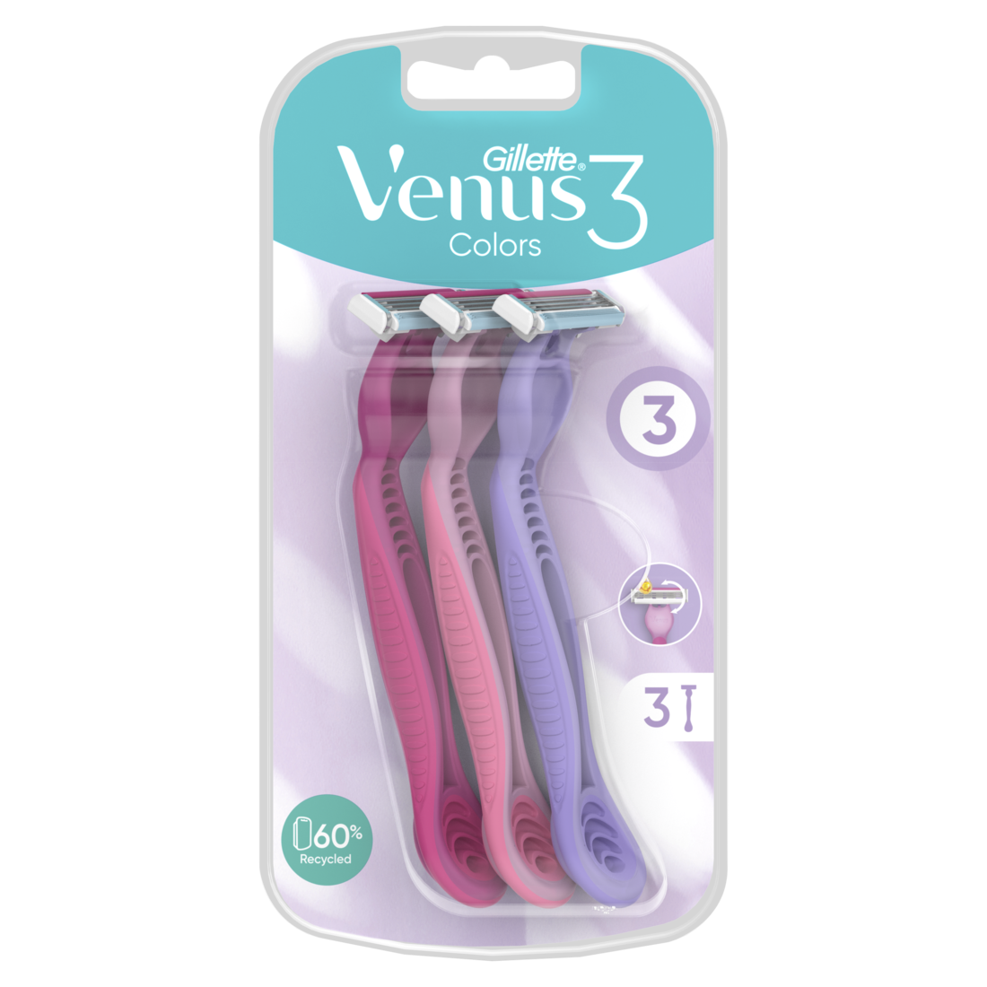 Dámská pohotová holítka Gillette Venus 3 Colors zajišťují hladké oholení za skvělou cenu. Tyto holicí strojky mají rukojeti ve více barvách. Díky nim bude holení zábava a pestrý zážitek. Mají výkyvnou holicí hlavici se 3 břity pro holení obtížně přístupných míst a zvlhčující pásek usnadňující skluz. Užijte si hladké holení s větším komfortem (v porovnání s holítky Venus Simply 2).