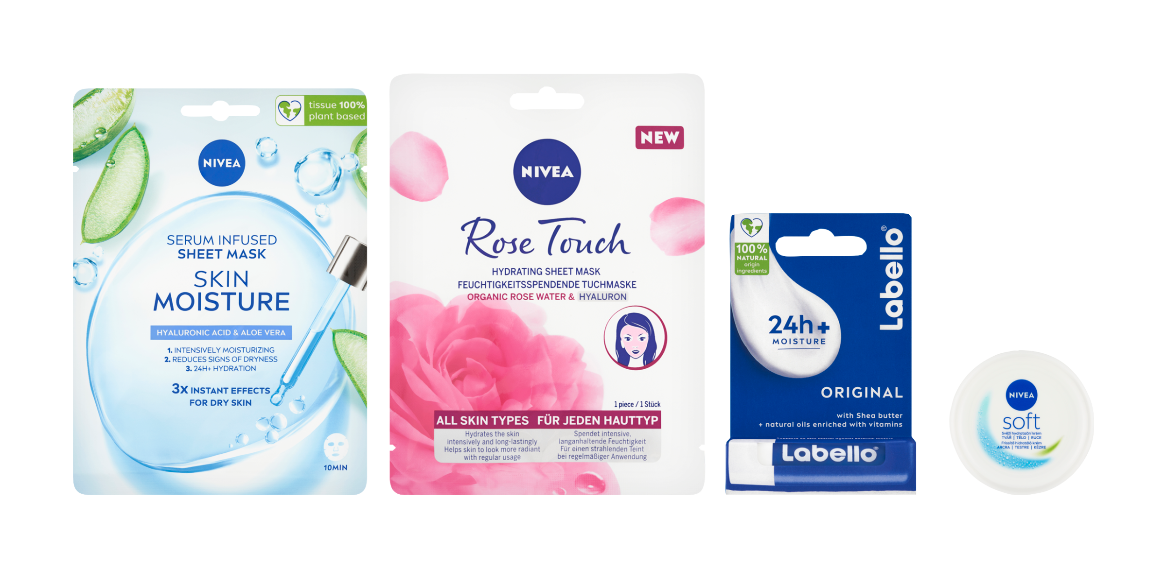 Labello Balzám na rty Original: Helianthus Annuus Hybrid Oil, Cera Alba, Hydrogenated Rapeseed Oil, Butyrospermum Parkii Butter, Tocopherol, Ascorbyl Palmitate, Helianthus Annuus Seed Oil, Lecithin, Linalool, Citronellol, Citral, Aroma NIVEA Hydratační textilní maska: Aqua, Butylene Glycol, Propanediol, Sodium Hyaluronate, Hydrolyzed Sodium Hyaluronate, Aloe Barbadensis Leaf Juice Powder, Vitis Vinifera Seed Oil, Argania Spinosa Kernel Oil, Magnolia Officinalis Bark Extract, Chondrus Crispus Extract, Lithothamnion Calcareum Extract, Allantoin, Betaine, Xanthan Gum, Polyglyceryl-10 Laurate, Xylitylglucoside, Hydroxyethylcellulose, Arginine, Anhydroxylitol, Saccharide Isomerate, Phytic Acid, Xylitol, Sodium Polyglutamate, Citric Acid, Sodium Citrate, Lactic Acid, Propylene Glycol, 1,2-Hexanediol, Hydroxyacetophenone, Phenoxyethanol, Parfum Nivea Soft krém 50ml: Aqua, Glycerin, Myristyl Alcohol, Alcohol Denat., Myristyl Myristate, Cetearyl Glucoside, Coco-Caprylate/Caprate, Glyceryl Stearate, Palmitic Acid, Stearic Acid, Hydrogenated Coco-Glycerides, Simmondsia Chinensis Seed Oil, Tocopheryl Acetate, Prunus Amygdalus Dulcis Oil, Vegetable Oil, Cetyl Ricinoleate, Triisostearin, Sorbitan Stearate, Hydroxypropyl Starch Phosphate, Sodium Hydroxide, Cetearyl Alcohol, Gellan Gum, Xanthan Gum, Myristic Acid, Arachidic Acid, Oleic Acid, Lauric Acid, Disodium Cetearyl Sulfosuccinate, Phenoxyethanol, Linalool, Citronellol, Alpha-Isomethyl Ionone, Acetyl Cedrene, Citrus Aurantium Peel Oil, Limonene, Terpineol, Lavandula Oil/Extract, Linalyl Acetate, Parfum Nivea Textilní maska Rose Care: Aqua, Butylene Glycol, Propanediol, Betaine, Hydroxyacetophenone, Chondrus Crispus Extract, Lithothamnium Calcarum Extract, PEG/PPG-17/6 Copolymer, PEG/PPG/Polybutylene Glycol-8/5/3 Glycerin, 1,2-Hexanediol, Xylitylglucoside, Anhydroxylitol, Xylitol, Glucose, Phenoxyethanol, Polyacrylic Acid, PEG-60 Hydrogenated Castor Oil, Arginine, Glycerin, Beta-glucan, Caprylyl Glycol, Sodium Benzoate, Allantoin, Saccharide Isomerate, Citric Acid, Sodium Citrate, Xanthan Gum, Rosa Damascena Flower Water, Potassium Sorbate, Sorbic Acid, Hydroxyethylcellulose, Disodium EDTA, Sodium Hyaluronate, Hydrolyzed Sodium Hyaluronate, Sodium Polyglutamate, Linalool, Geraniol, Citronellol, Limonene, Methyl Benzoate, Tocopherol, Parfum