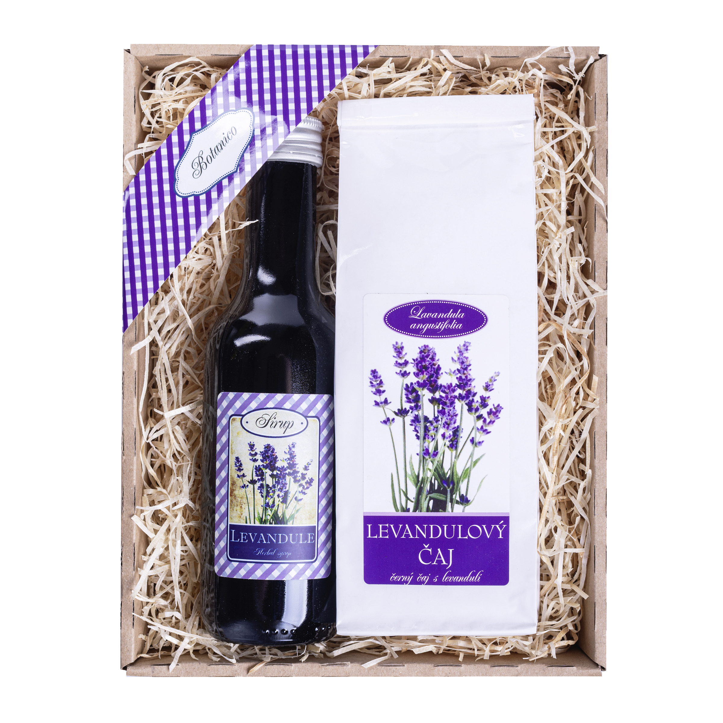 Levandulový sirup: glukózový sirup, levandule 10% vodný extrakt 2%, konzervant: sorban draselný. Černý čaj s levandulí: černý čaj, levandule.