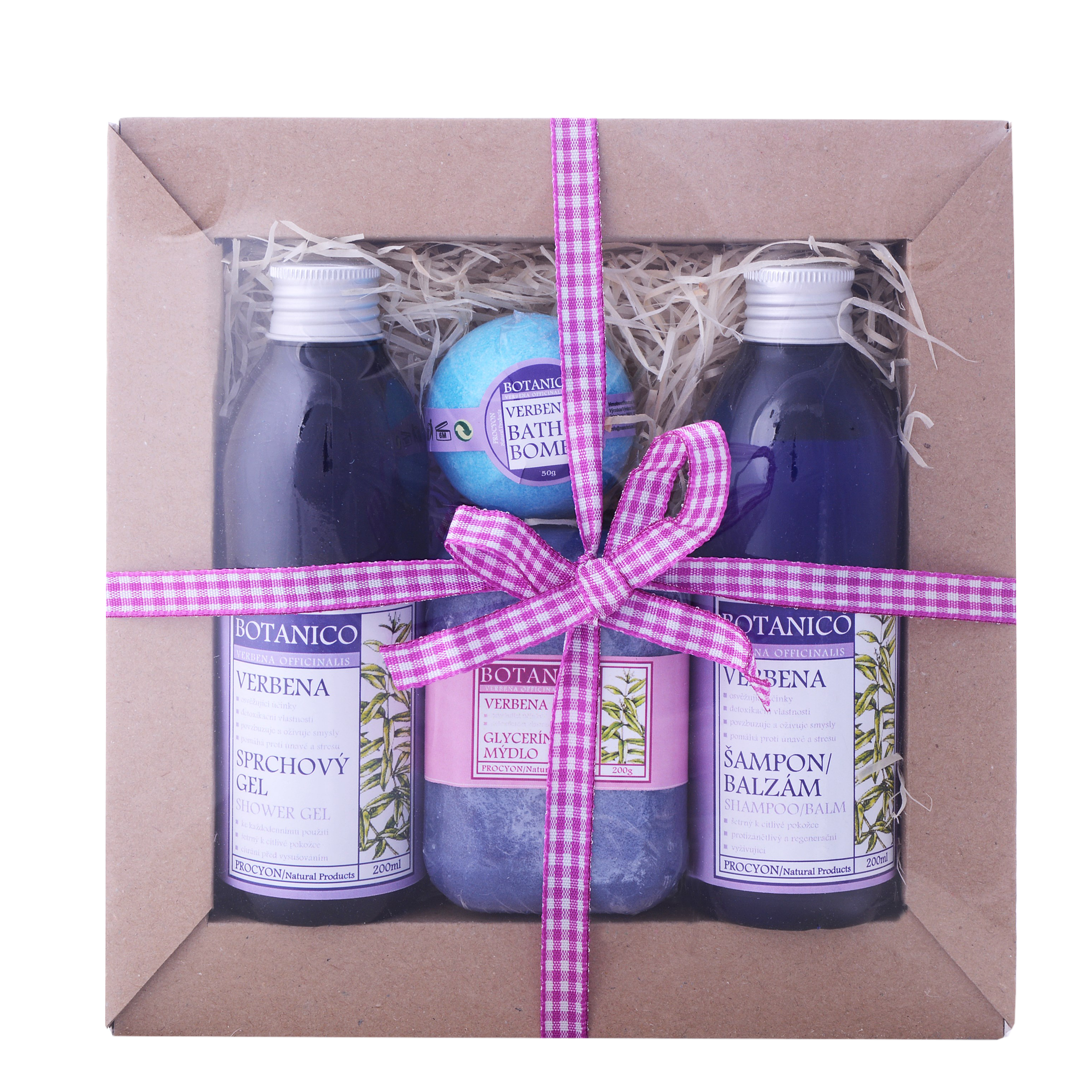 - Dárková sada v papírovém čtverci obsahuje šampon s balzámem 200 ml, sprchový gel 200 ml, bath bombs 50 g, glycerínové mýdlo 200 g.