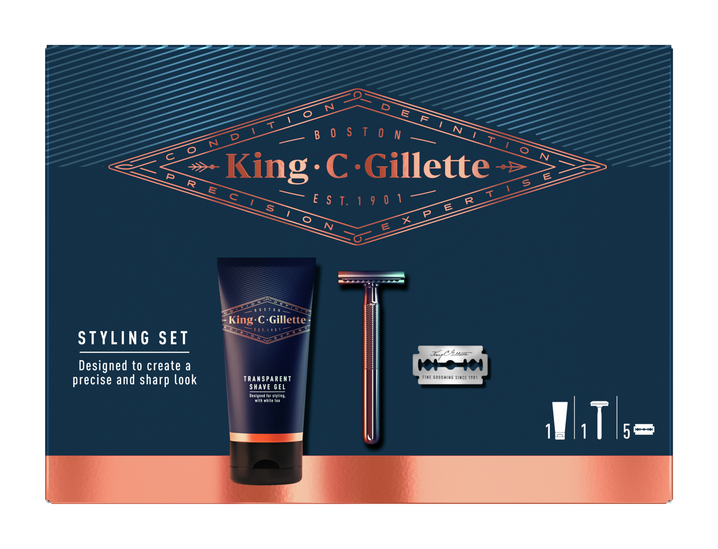Darujte prémiové produkty na péči o vousy a jejich úpravu v pánské dárkové sadě King C. Gillette. Obsahuje transparentní gel na holení, žiletkový holicí strojek a 5 klasických žiletek. Vrchol více než sta let inovací a expertizy a jediná řada, která nese jméno zakladatele společnosti: King C. Gillette. Tento holicí strojek v kultovním designu se inspiruje dlouholetou tradicí značky Gillette a zaručuje dokonale precizní tvarování vousů. Žiletka s ostřím potaženým platinou upravuje vousy s naprostou přesností a je ideální pro tvarování kotlet a výrazných linií bradky. Design hlavy s uzavřeným nástavcem umožňuje skvělou kontrolu při holení, kvalitní chromovaná rukojeť je zase zárukou dlouhé životnosti. Transparentní nepěnivý gel na holení od Gillette s obsahem bílého čaje a arganového oleje aktivně chrání pokožku během holení a pomáhá s každodenním přesným tvarováním vousů.