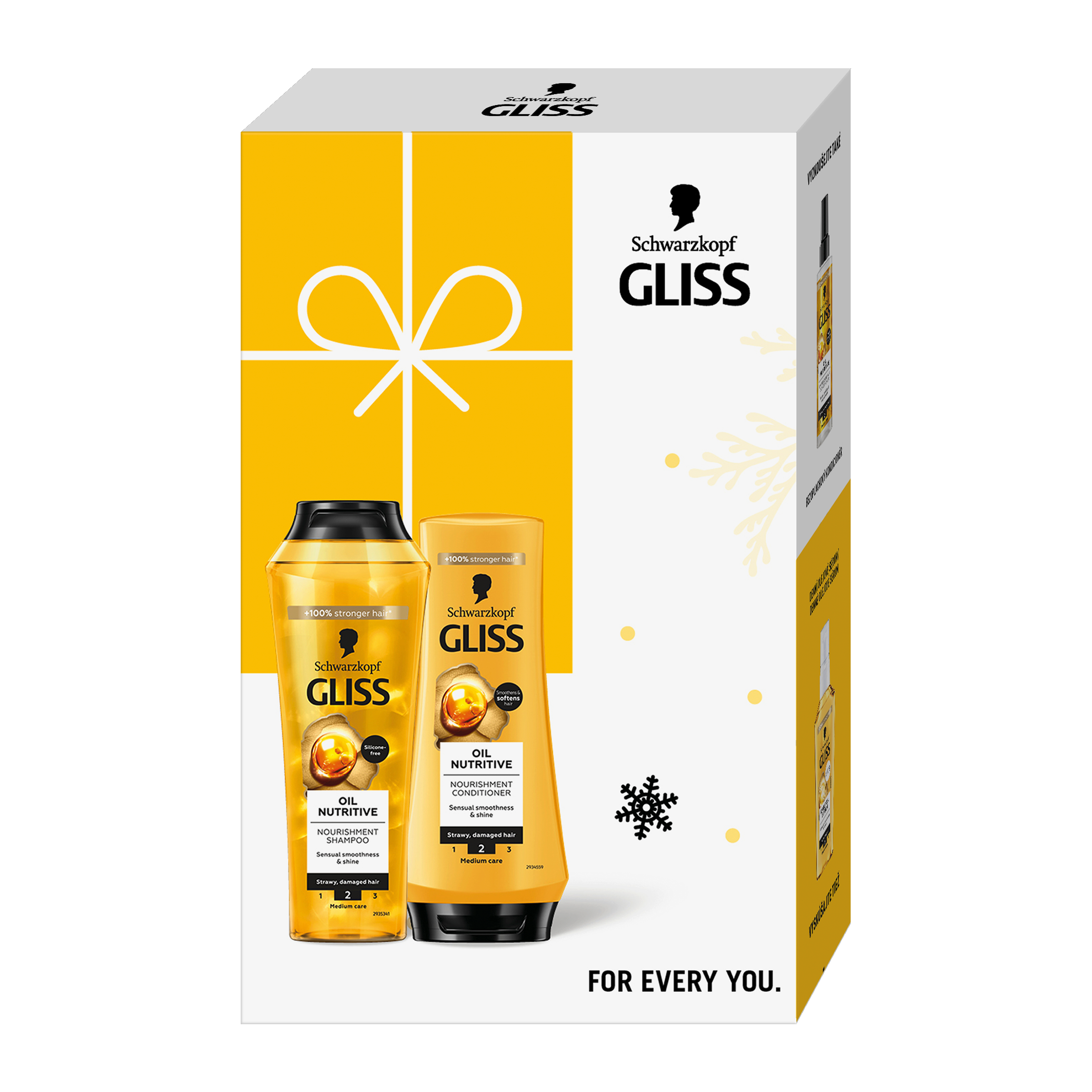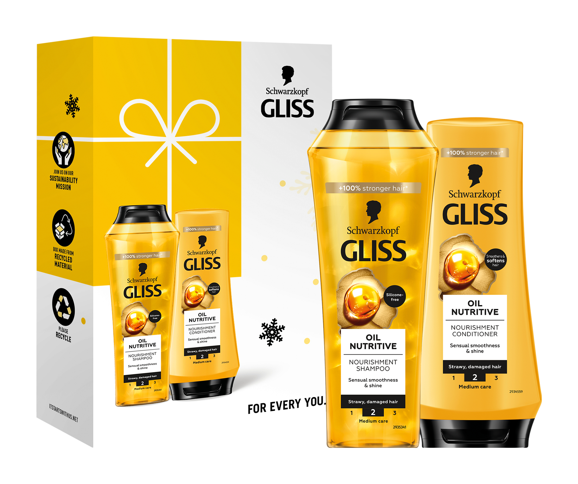 Obdarujte své blízké originálním a současně praktickým dárkem značkové vlasové kosmetiky Schwarzkopf Gliss Oil Nutritive. Vánoční balíček Schwarzkopf Gliss Oil Nutritive udělá radost mamince, babičce, kamarádce a každému, kdo chce mít o své vlasy dokonale postaráno! Schwarzkopf Gliss Oil Nutritive vyživující šampon je vhodný pro lámavé a poškozené vlasy. Aby vaše vlasy zůstaly pružné a zdravě vypadající, potřebují rozsáhlou péči.