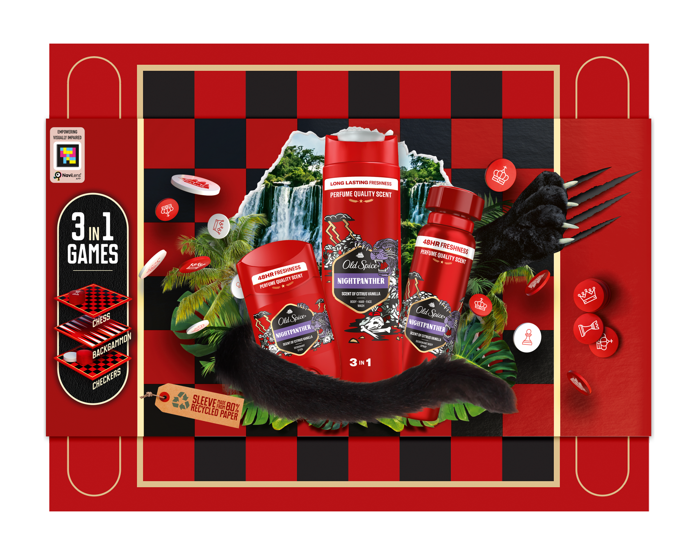 - Dárková sada obsahuje znovu použitelnou herní krabičku Old Spice s magnetickým zavíráním a 3 vytištěnými deskovými hrami