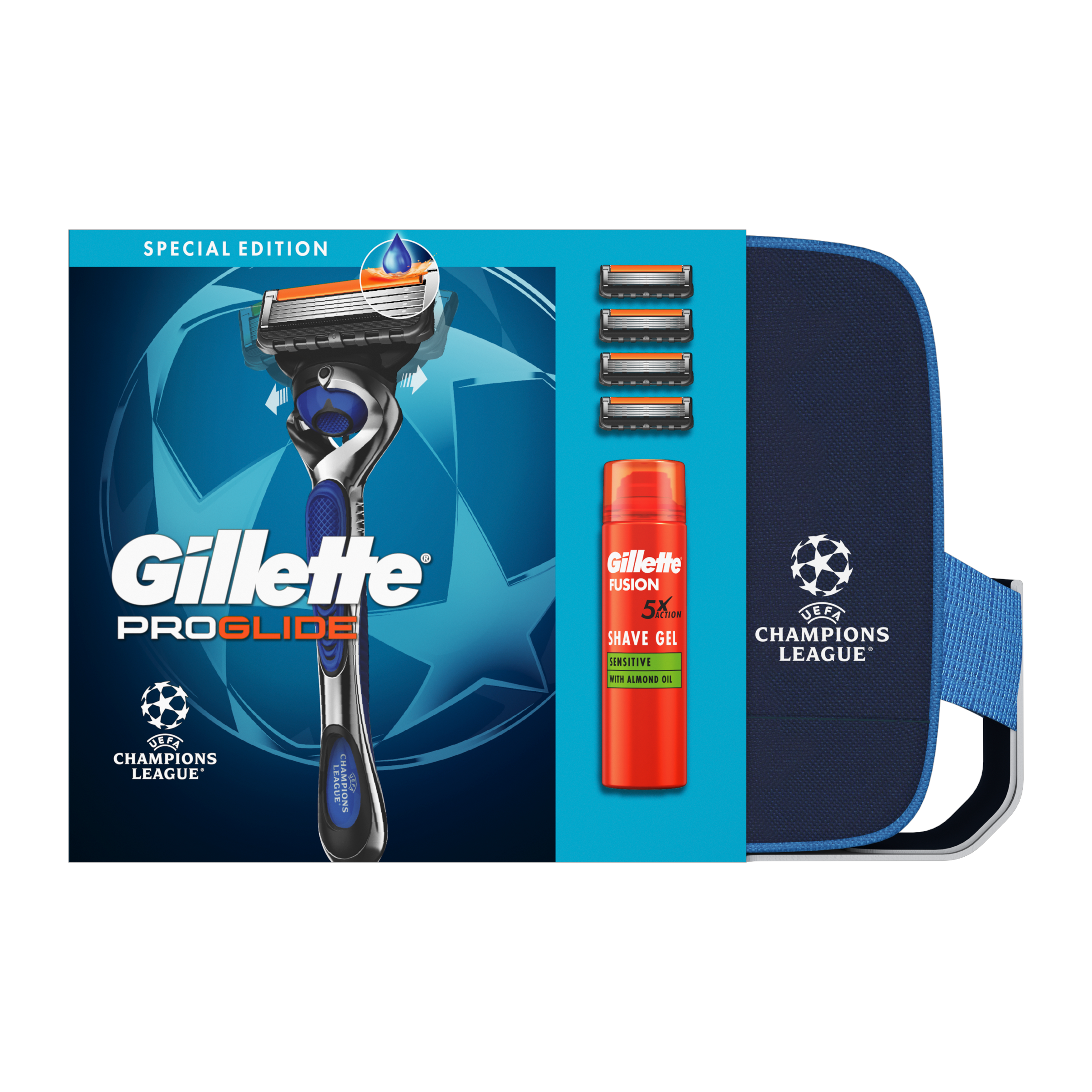Dárková sada UEFA Champions League Special Edition obsahuje: pánský holicí strojek Gillette ProGlide, 4 holicí hlavice a holicí gel Gillette Fusion.