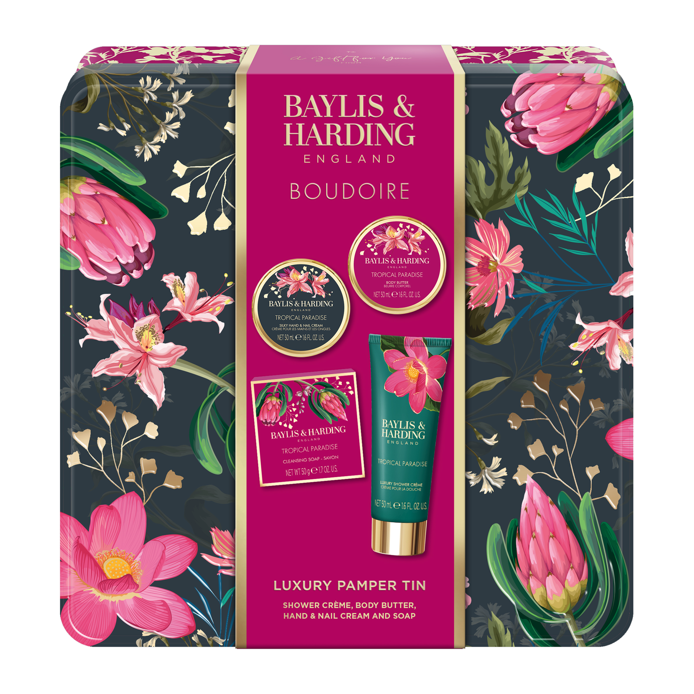 Dopřejte své pokožce exotické rozmazlování s dárkovou sadou péče o tělo v dóze Boudoire. Čtyři pečující přípravky s tropickou vůní banánu, broskve a pomerančových květů promění běžný mycí rituál v chvíle luxusní relaxace. Sprchový krém a tuhé mýdlo jemně čistí a osvěžují, zatímco tělové máslo a krém na ruce intenzivně hydratují a vyživují pokožku. Výsledkem je hladká, vláčná a nádherně provoněná pokožka od hlavy až k patě. Elegantní plechová dóza navíc činí z této sady perfektní dárek pro každou příležitost.