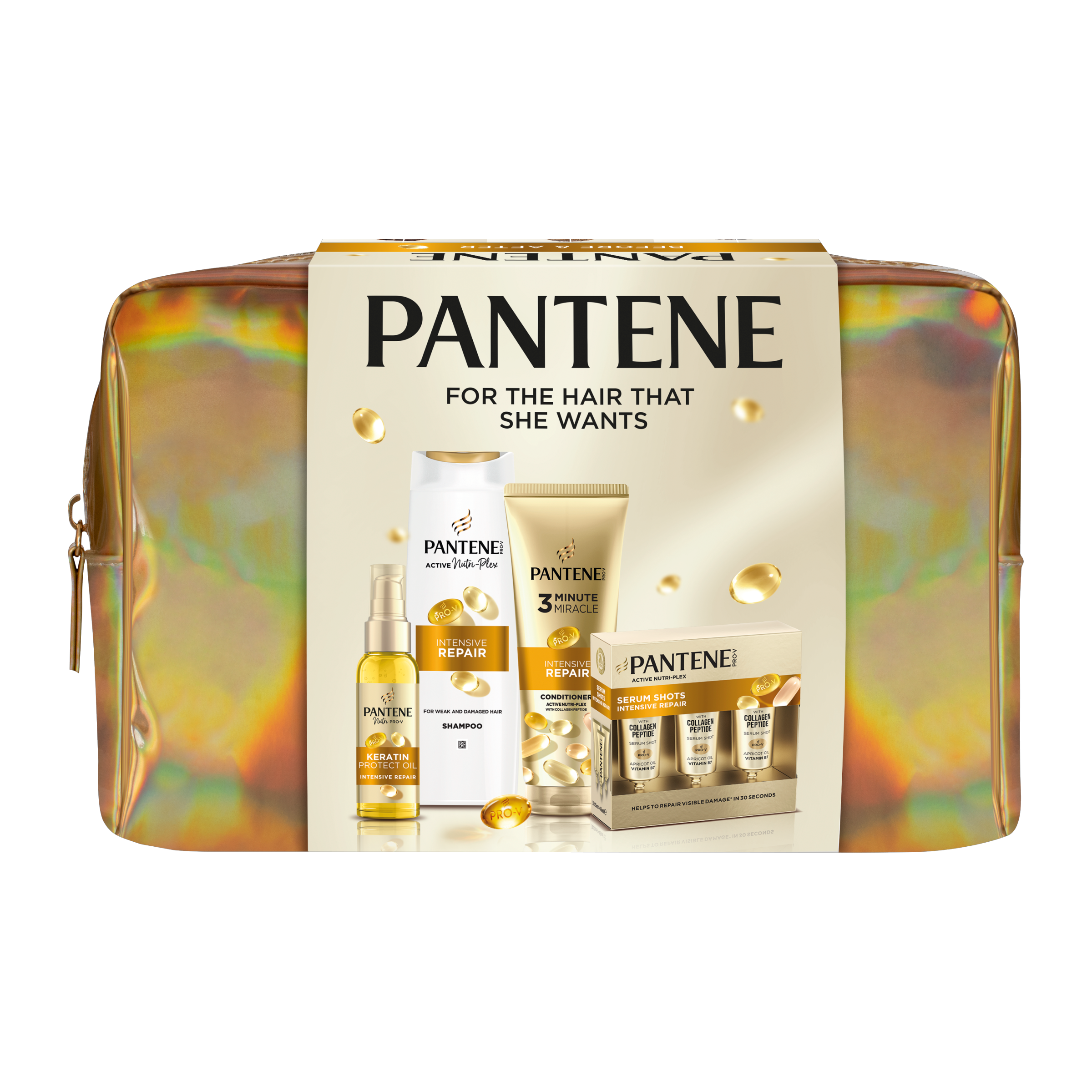 Dárková sada pro ženy obsahuje olej na vlasy Keratin Protection, šampon na vlasy Intensive Repair, kondicionér na vlasy Intensive Repair a sérum na vlasy Pantene Intensive Repair.