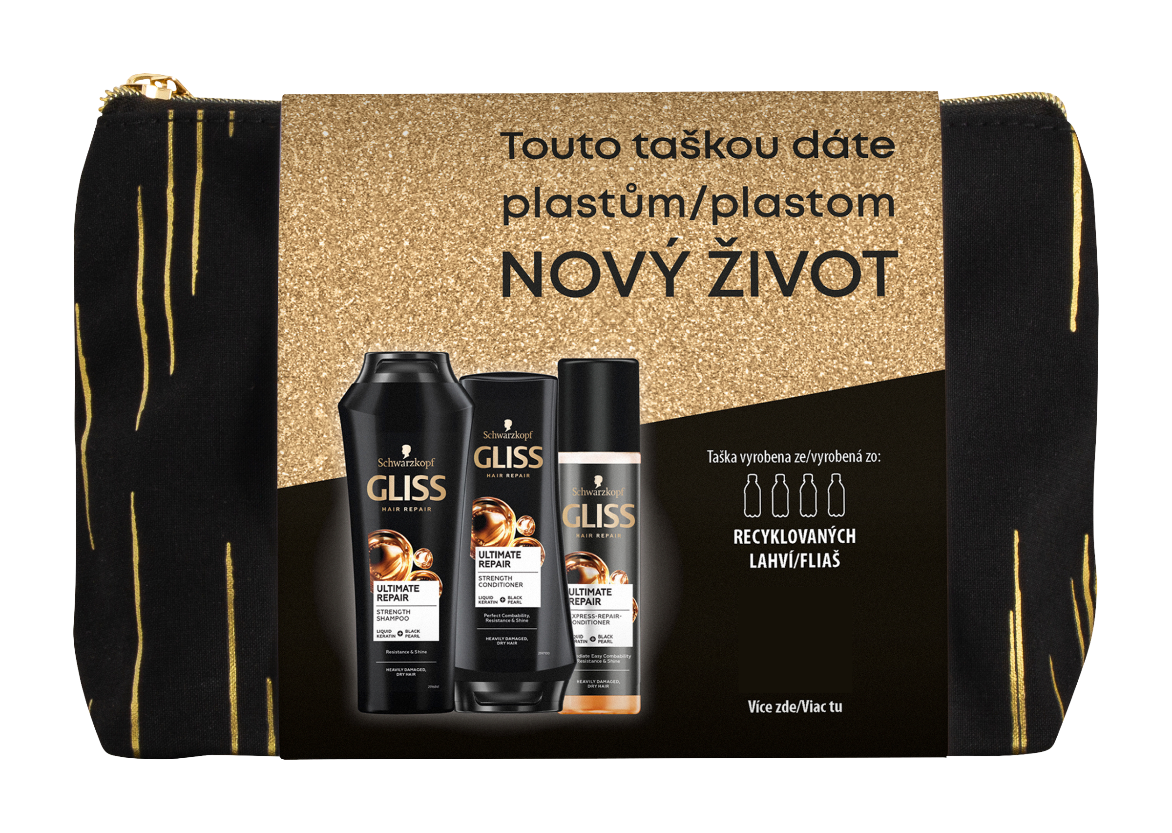 Vánoční balíček regenerační péče o vlasy Schwarzkopf GLISS ULTIMATE REPAIR je nepostradatelnou součástí rituálu pro všechny ženy, které mají suché a velmi poškozené vlasy. Gliss Ultimate Repair šampon Gliss Ultimate Repair kondicionér Gliss Ultimate Repair expresní kondicionér