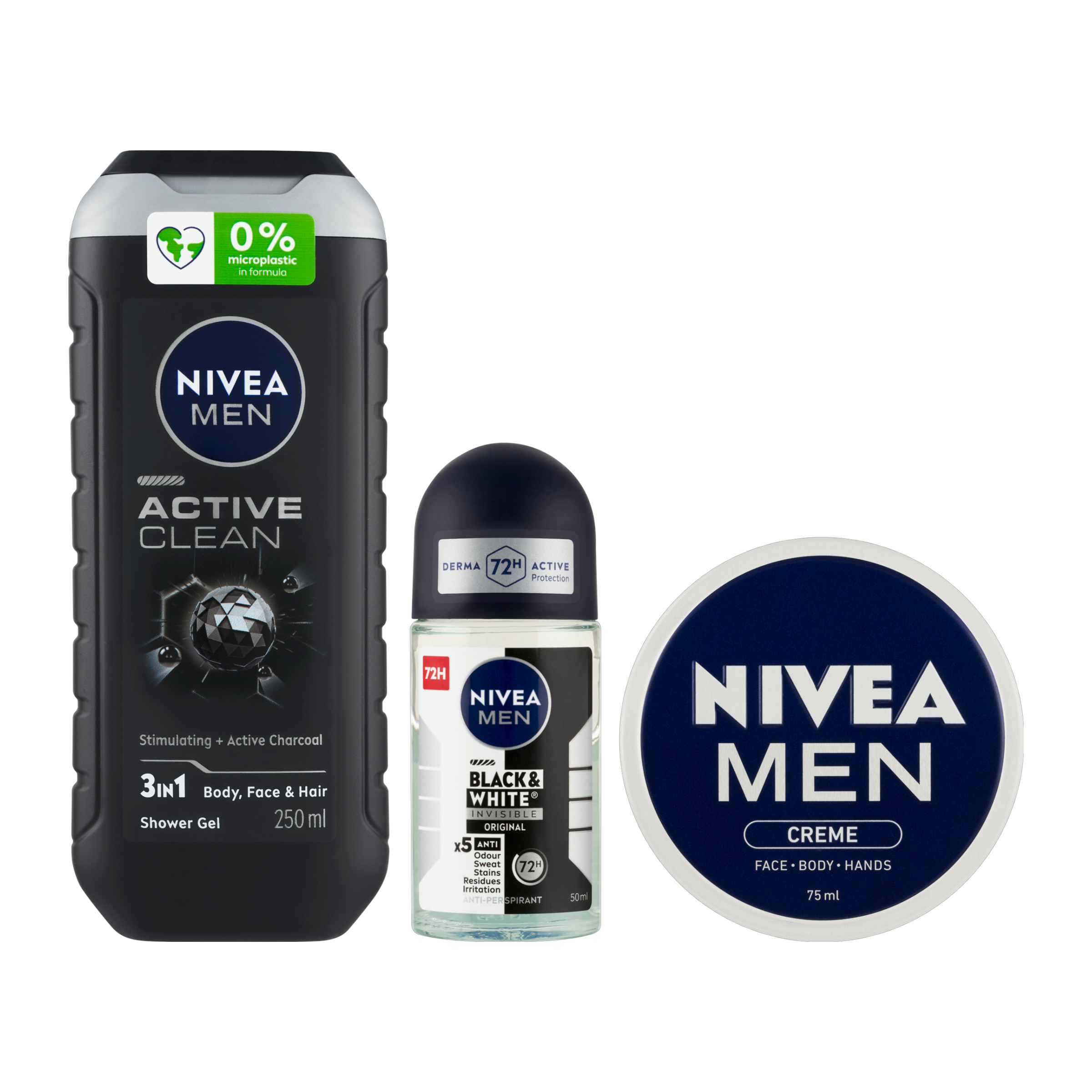Nivea Men krém 75ml: Aqua, Glycerin, Paraffinum liquidum, Alcohol denat., Cetyl alcohol, Glyceryl stearate, Hydrogenated coco-glycerides, Stearyl alcohol, Palmitic acid, Stearic acid, Cera microcristallina, Tocopheryl acetate, Sodium hydroxide, Dimethicone, Myristic acid, Arachidic acid, Oleic acid, Carbomer, Phenoxyethanol, Methylparaben, BHT, Parfum Nivea Men Kuličkový AP B&W Inv. Original: Aqua, Aluminum Chlorohydrate, Isoceteth-20, Dicaprylyl Ether, Butylene Glycol, Glyceryl Isostearate, Palmitamidopropyltrimonium Chloride, Laureth-7 Citrate, PEG-150 Distearate, Propylene Glycol, Tocopherol, Tetramethyl Acetyloctahydronaphthalenes, Citric Acid, Pogostemon Cablin Oil, Linalyl Acetate, Limonene, Citrus Aurantium Peel Oil, Beta-Caryophyllene, Pinene, Geraniol, Rose Ketone, Hydrogenated Palm Glycerides Citrate, Parfum Nivea MEN Sprch. gel Active Clean 250ml: Aqua, Sodium Laureth Sulfate, Cocamidopropyl Betaine, Decyl Glucoside, Charcoal Powder, Glycerin, Coco-Glucoside, Citric Acid, Glycol Distearate, Sodium Chloride, Cellulose, Cellulose Gum, Sodium Benzoate, Benzoic Acid, Linalool, Parfum