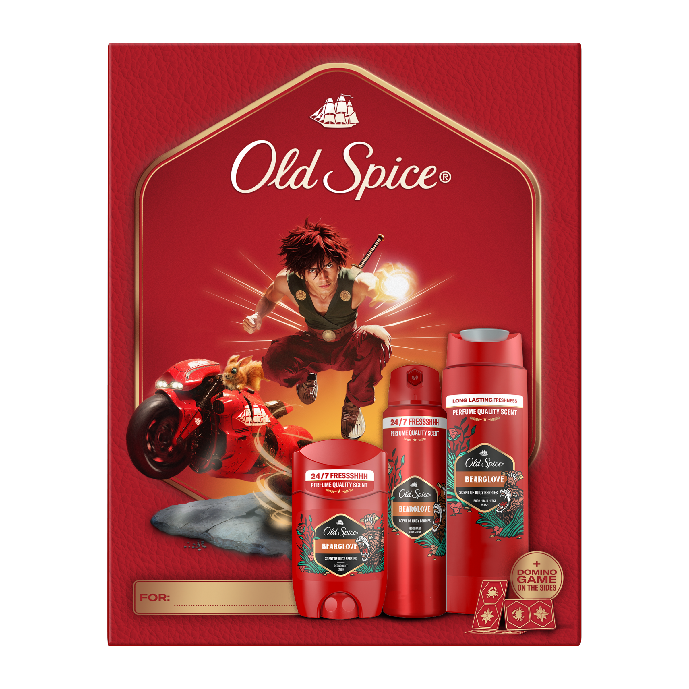 Hledáš dokonalý dárek pro fanouška anime, aby mohl žít duchem své oblíbené postavy s vášní a legendární vůní? Už ho nemusíš dále hledat! Dárková sada obsahuje tuhý deodorant, sprej a sprchový gel pro muže Bearglove, vše krásně zabalené v kartonové krabičce s designem Anime. Kromě toho obsahuje hru domino, kterou si sestavíš sám: jednoduše vystříhej kousky z krabičky a užij si voňtastický okamžik! S vůní parfémové kvality Old Spice Bearglove nemůžeš udělat chybu: tato vůně šťavnatých bobulí, pikantních citrusů a křupavého jablíčka se spojila s nádechem koření, aby ses díky nim stal lesním tvorem, kterému nikdo neodolá. Proč ještě nemáš tuto dárkovou sadu Old Spice ve svém košíku?