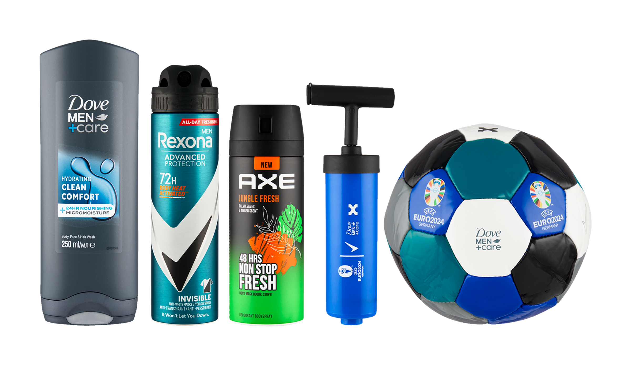 Osprchuj se Dove M+C Clean Comfort sprchovým gelem, nastříkej se Rexona Advanced Protection Invisible antiperspirantem, který tě ochrání před potem a zápachem po celý den, osvěž se a voň ikonicky s Axe Jungle Fresh! Navíc jsme ti do tohoto speciálního balíčku přibalili fotbalový míč s pumpou, abys mohl trénovat tahy na branku odpozorované při sledování evropského šampionátu.