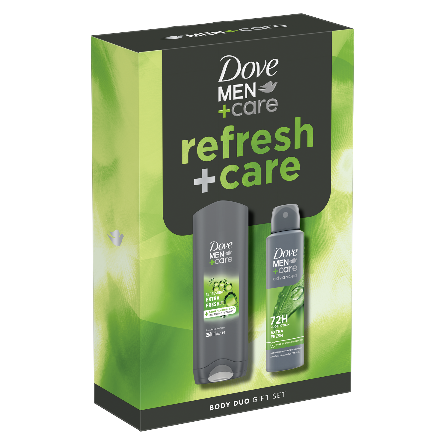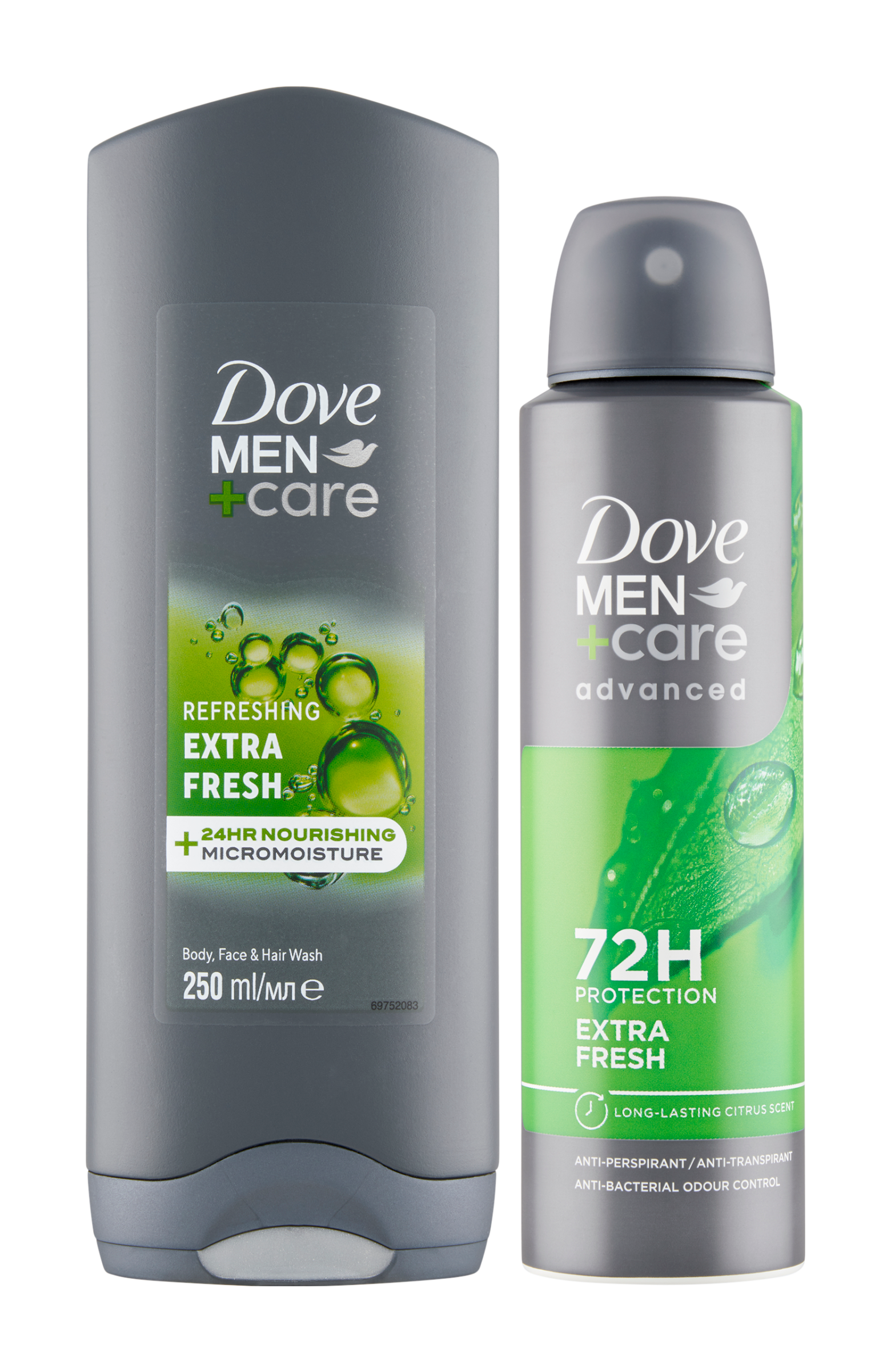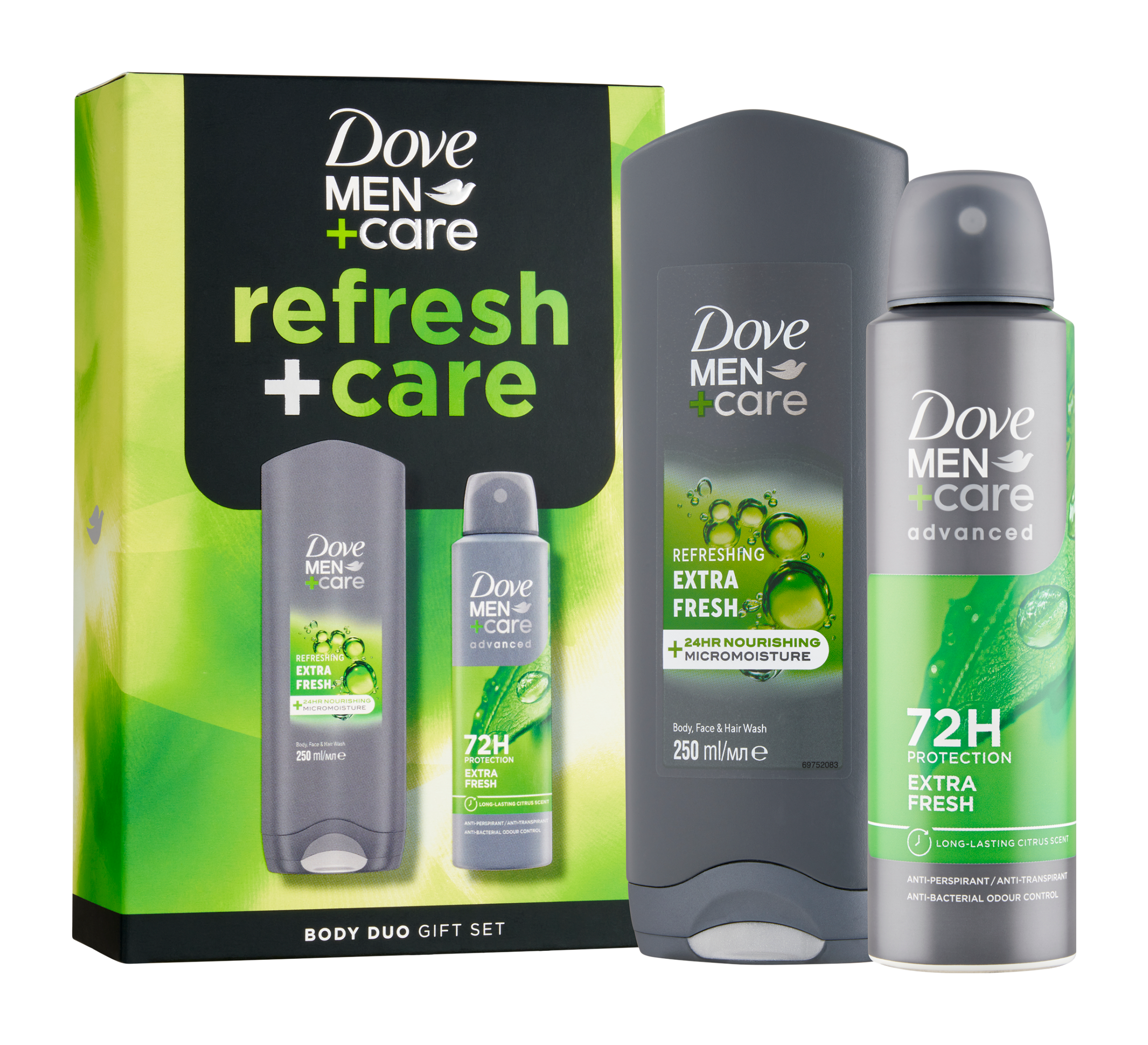 Obdarujte svého blízkého vánočním balíčkem Dove Men+Care Extra Fresh. Jedinečné složení sprchového gelu Dove Men+Care Extra Fresh s technologií MicroMoisture, která se aktivuje napěněním gelu, pomáhá uzamykat v pokožce její přirozenou vlhkost a zanechává ji svěží a hydratovanou. Díky účinnému složení přináší tento pánský sprchový gel pokožce extra osvěžení a celkové pohodlí. Zároveň je natolik jemný, že jej můžete použít i pro péči o pokožku obličeje. Antiperspirant Dove Men+Care Advanced Extra Fresh pomáhá bojovat s potem a tělesným pachem po dobu až 72 hodin. Technologie s ¼ hydratačního krému pomáhá pokožku chránit proti podráždění. Tohle duo je skutečný základ pro muže, který dodá pokožce potřebnou vůni a hydrataci.