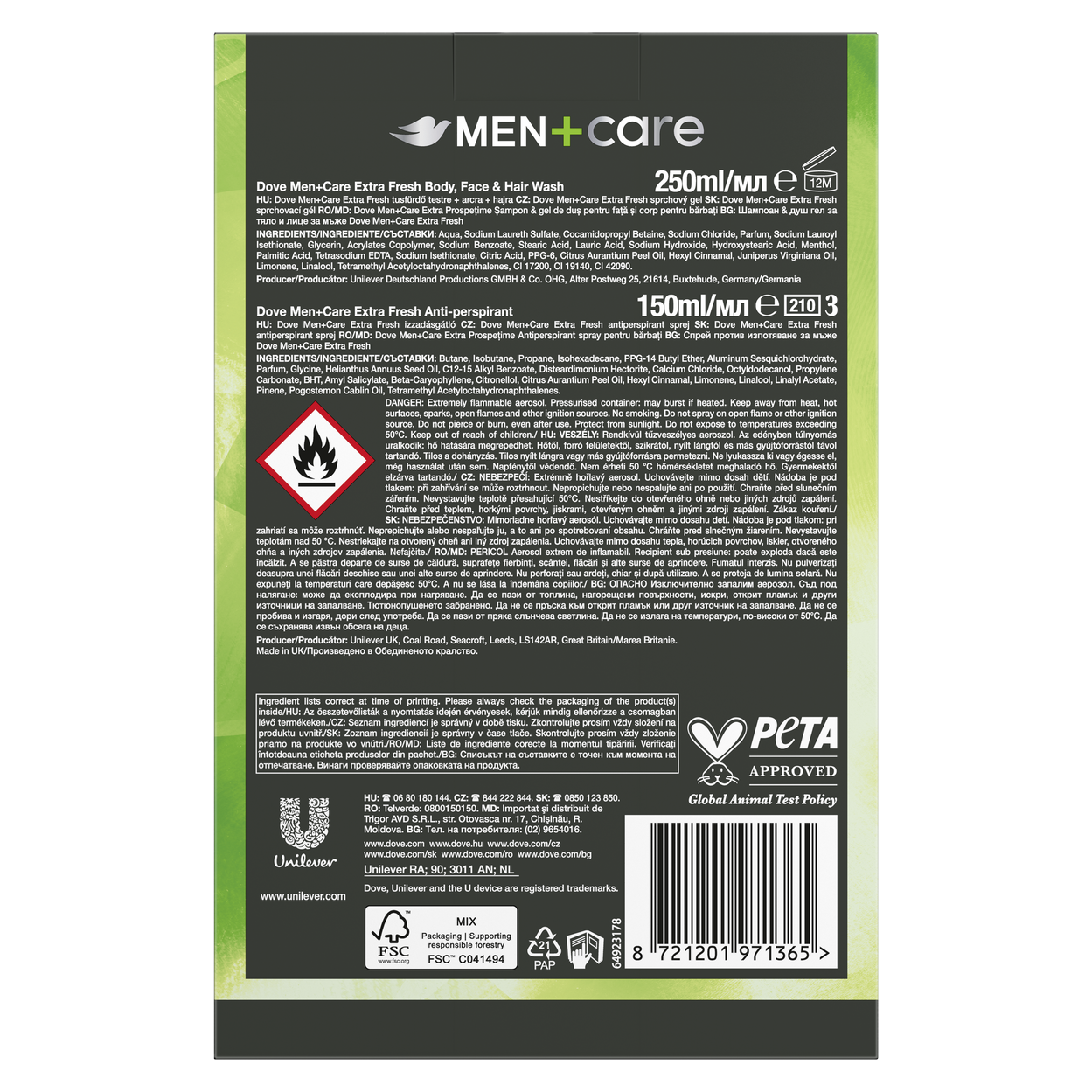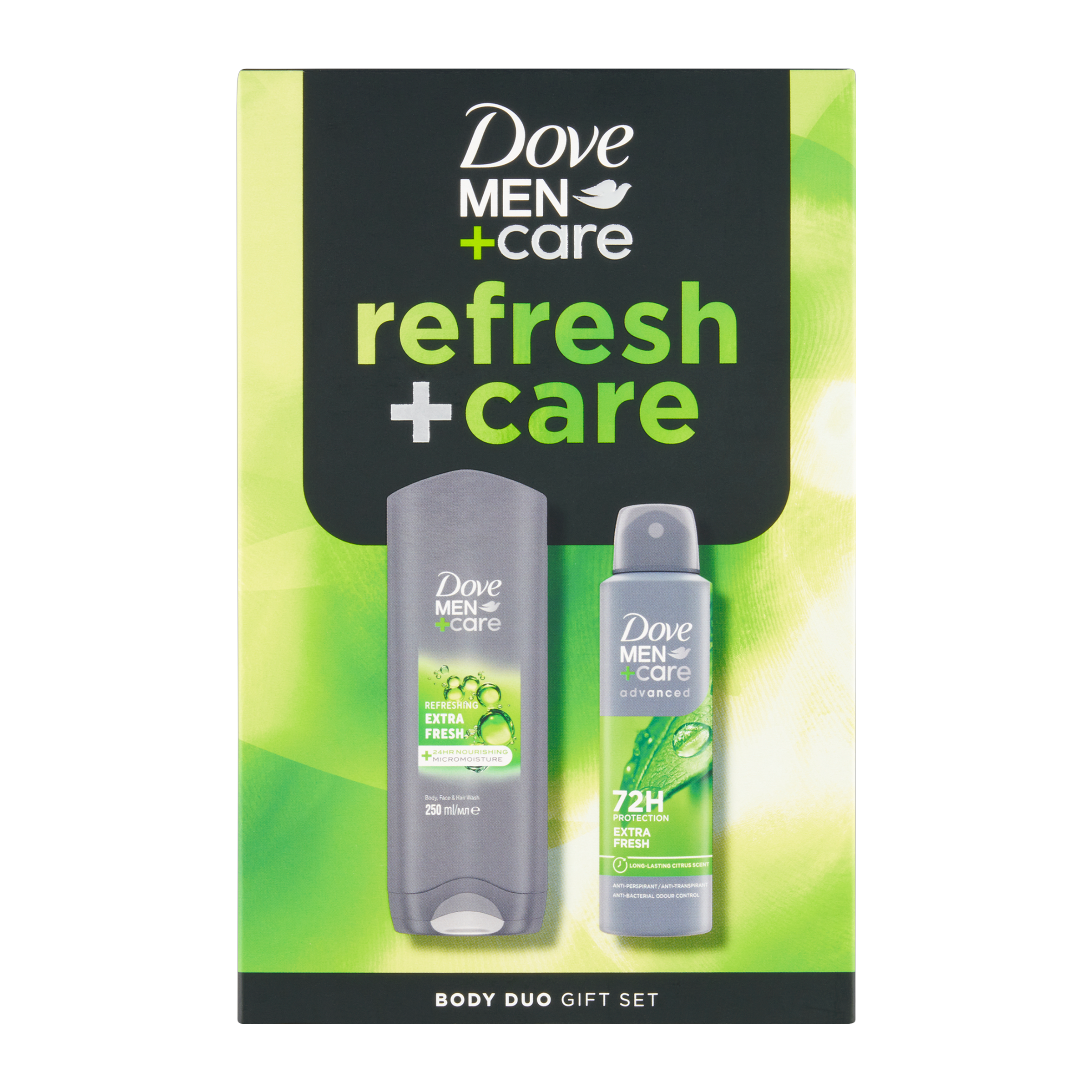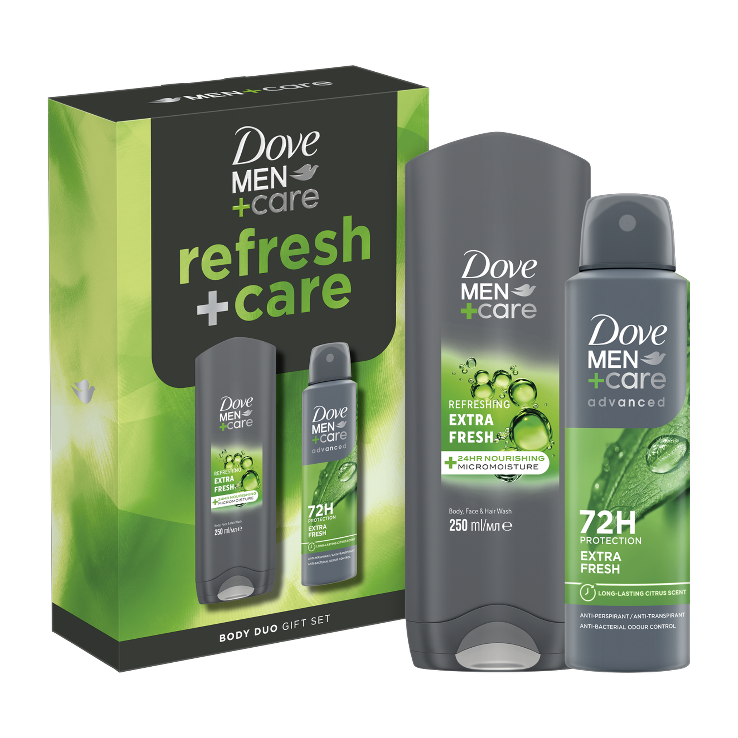 Obdarujte svého blízkého vánočním balíčkem Dove Men+Care Extra Fresh. Jedinečné složení sprchového gelu Dove Men+Care Extra Fresh s technologií MicroMoisture, která se aktivuje napěněním gelu, pomáhá uzamykat v pokožce její přirozenou vlhkost a zanechává ji svěží a hydratovanou. Díky účinnému složení přináší tento pánský sprchový gel pokožce extra osvěžení a celkové pohodlí. Zároveň je natolik jemný, že jej můžete použít i pro péči o pokožku obličeje. Antiperspirant Dove Men+Care Advanced Extra Fresh pomáhá bojovat s potem a tělesným pachem po dobu až 72 hodin. Technologie s ¼ hydratačního krému pomáhá pokožku chránit proti podráždění. Tohle duo je skutečný základ pro muže, který dodá pokožce potřebnou vůni a hydrataci.