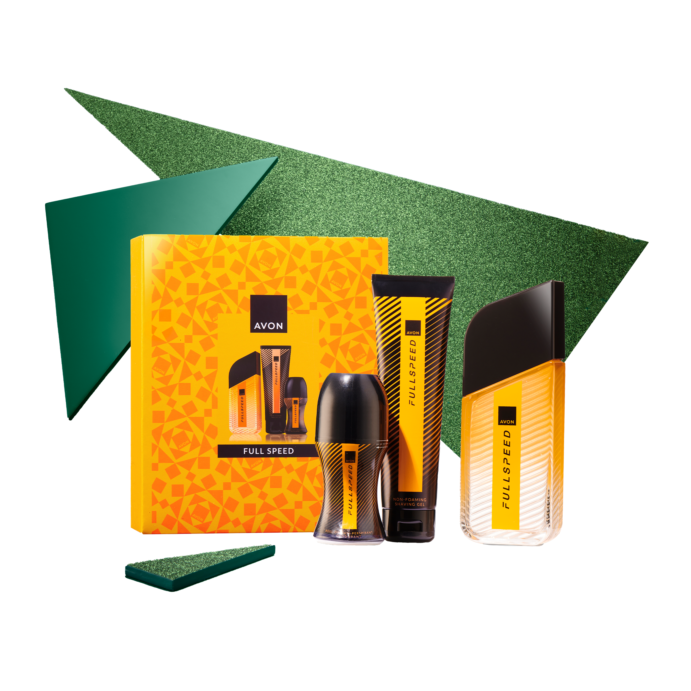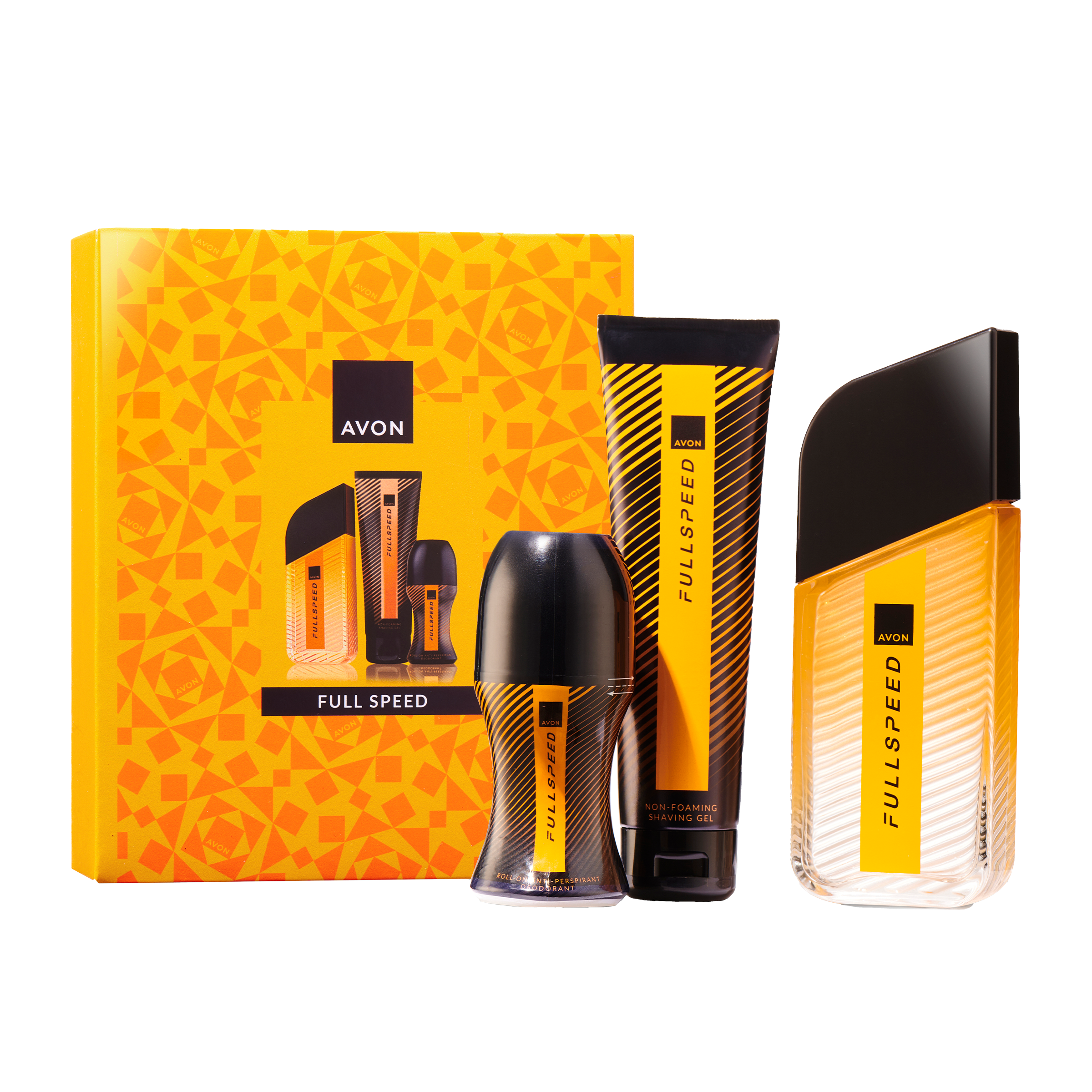 Dárková sada obsahuje toaletní vodu pro muže Full Speed (100 ml), kuličkový deodorant antiperspirant (50 ml) a nepěnící gel na holení (100 ml)