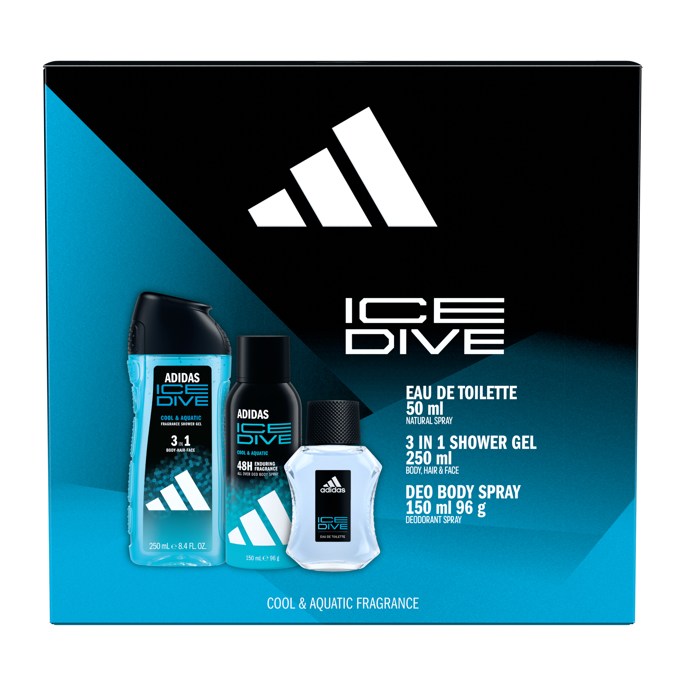 Vánoční kazeta pro muže. Obsahuje: toaletní vodu pro muže Adidas ICE DIVE (50 ml), body spray (150 ml) a sprchový gel Cool & Aquatic (250 ml)