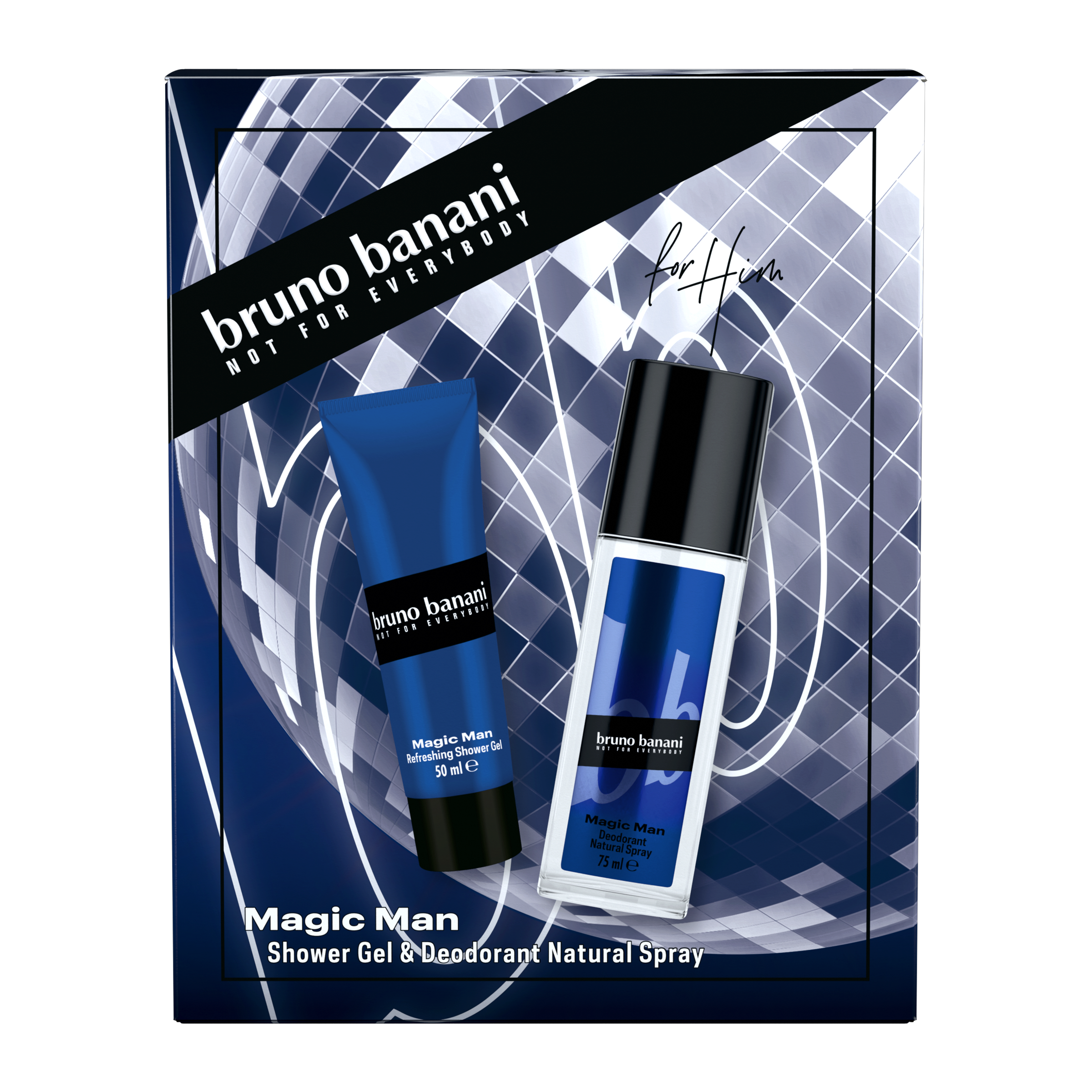 Vánoční kazeta pro muže obsahuje deodorant natural spray Bruno Banani Magic Man (75 ml) a sprchový gel pro muže (50 ml).