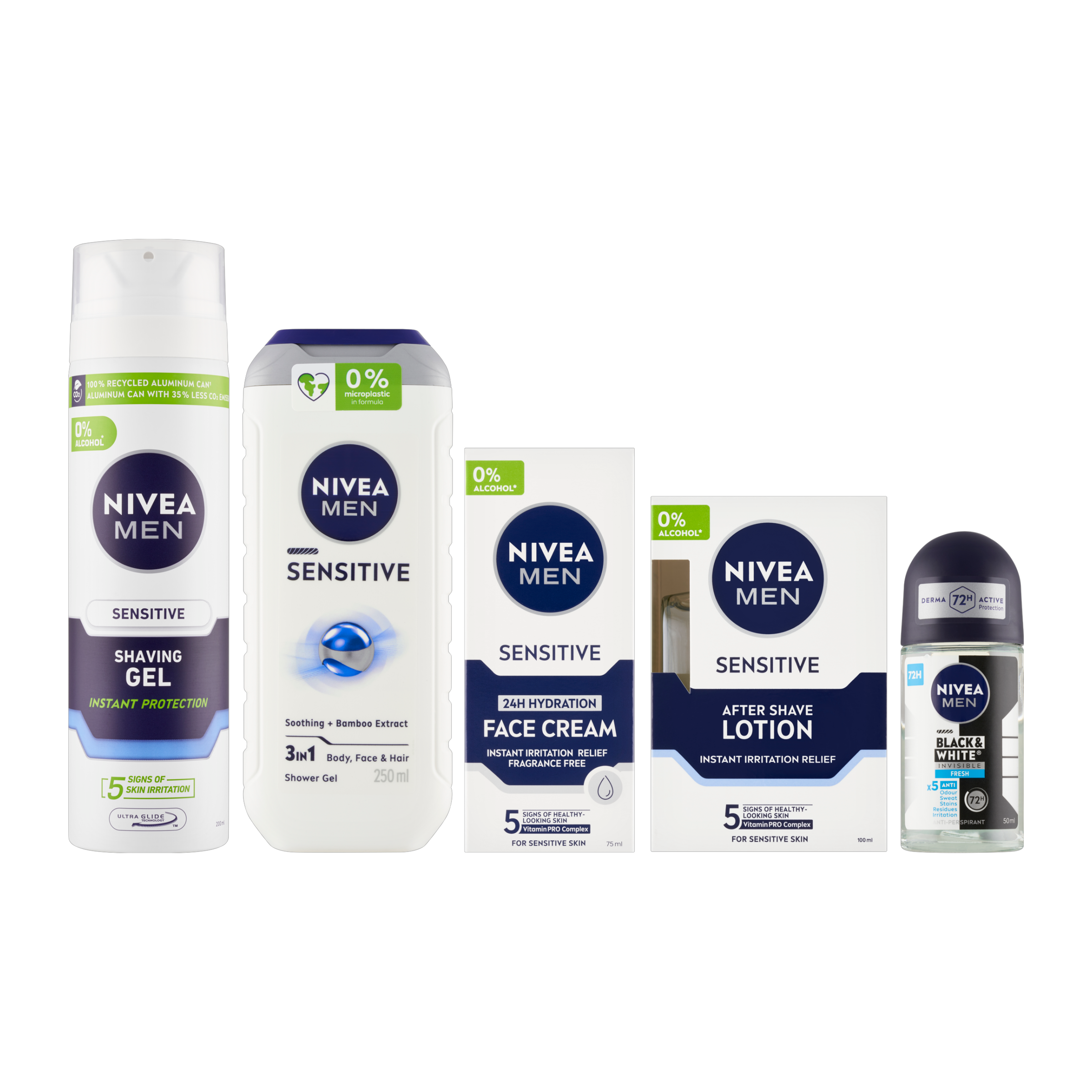 NIVEA MEN velký box kosmetiky obsahuje vše, co muž potřebuje pro kompletní péči o citlivou pokožku celého těla. Každá očista začíná ve sprše. Sprchový gel Sensitive s výtažky z bambusu jemně umyje celé tělo, včetně tváře a vlasů. Pro dokonale hladké oholení použijte gel na holení Sensitive s výtažky z heřmánku a vitamínem E, díky kterým předejdete podráždění. Následně zklidníte pokožku vodou po holení Sensitive. Péči završte hydratačním pleťovým krémem Sensitive, který poskytne pleti potřebnou 24hodinovou hydrataci. Nezapomínáme ani na ochranu proti pocení. Kuličkový antiperspirant Black & White vás ochrání proti pocení a zápachu až 72 hodin a propůjčí vašemu tělu svěží mužnou vůni.
