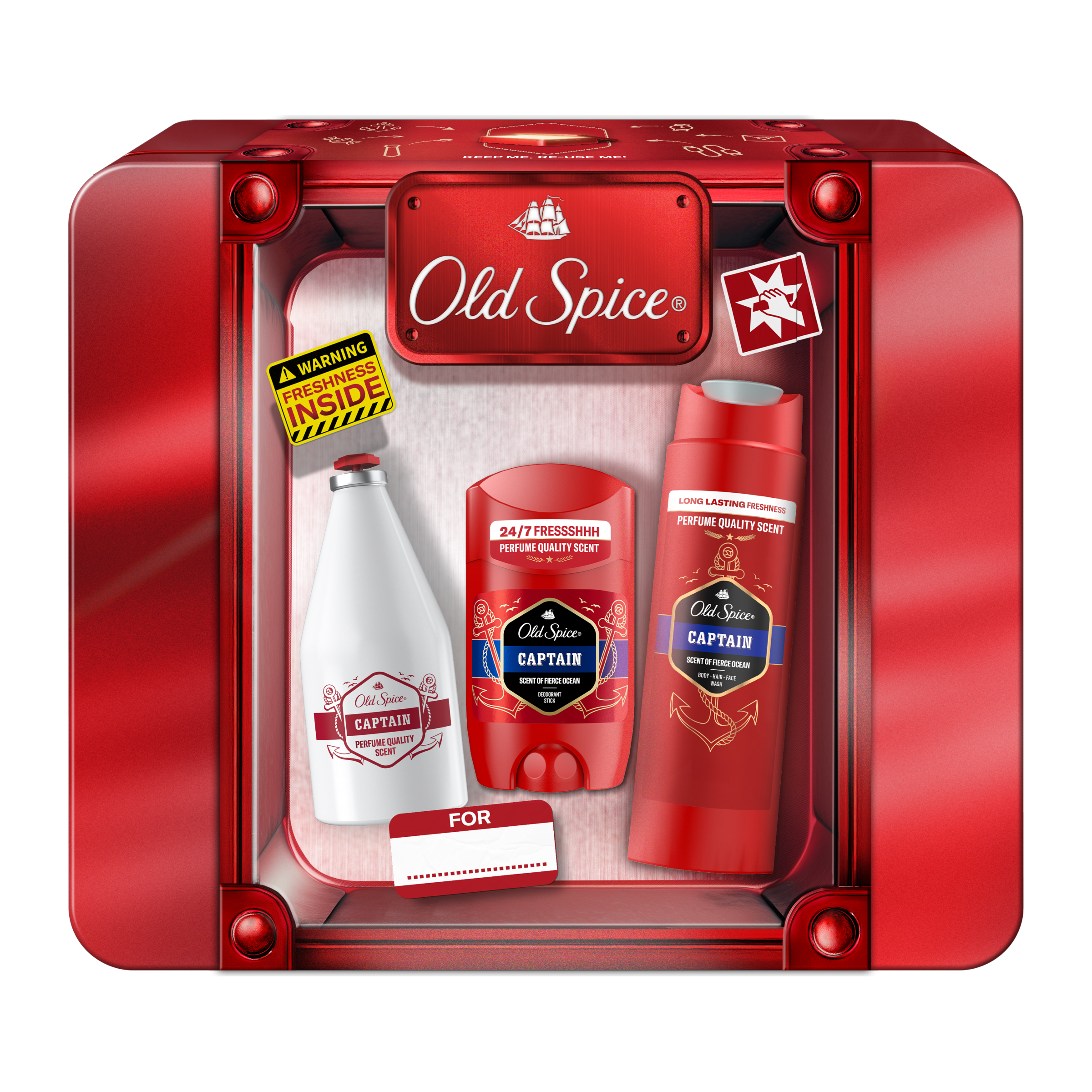 Hledáš dokonalý dárek pro muže, aby mohl sebevědomě kráčet životem s legendární vůní? Už ho nemusíš dále hledat! Dárková sada Tin Box obsahuje tuhý deodorant, sprchový gel a vodu po holení pro muže Captain. To vše krásně zabalené v originální plechovce Old Spice, kterou lze použít opakovaně k uložení cenností nebo jakéhokoli tajného pokladu muže. S vůní parfémové kvality Old Spice Captain: vůni dravých mořských vln, santalového dřeva a pikantního bergamotu, která tě promění v nebojácného kapitána svěžesti, se nemůžeš splést. Proč ještě nemáš tuto dárkovou sadu Old Spice ve svém košíku?