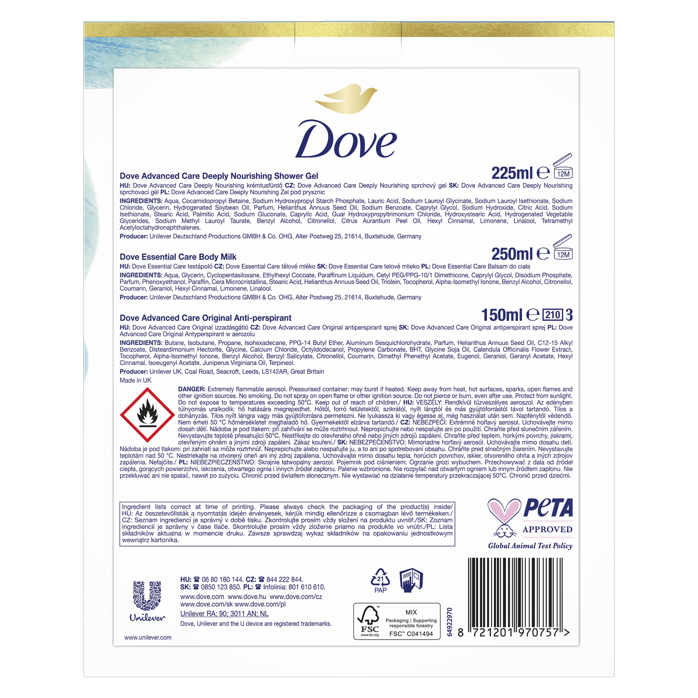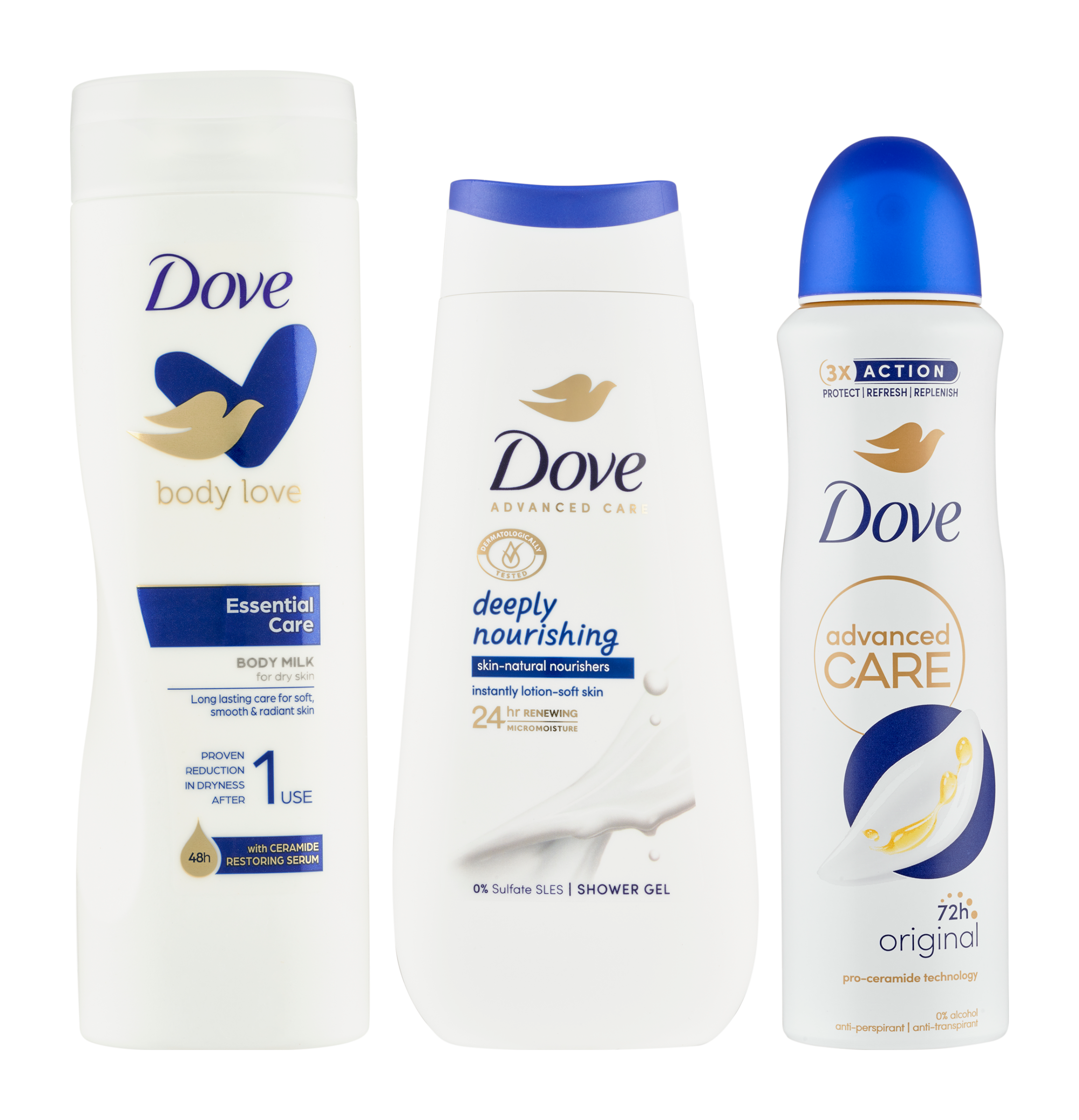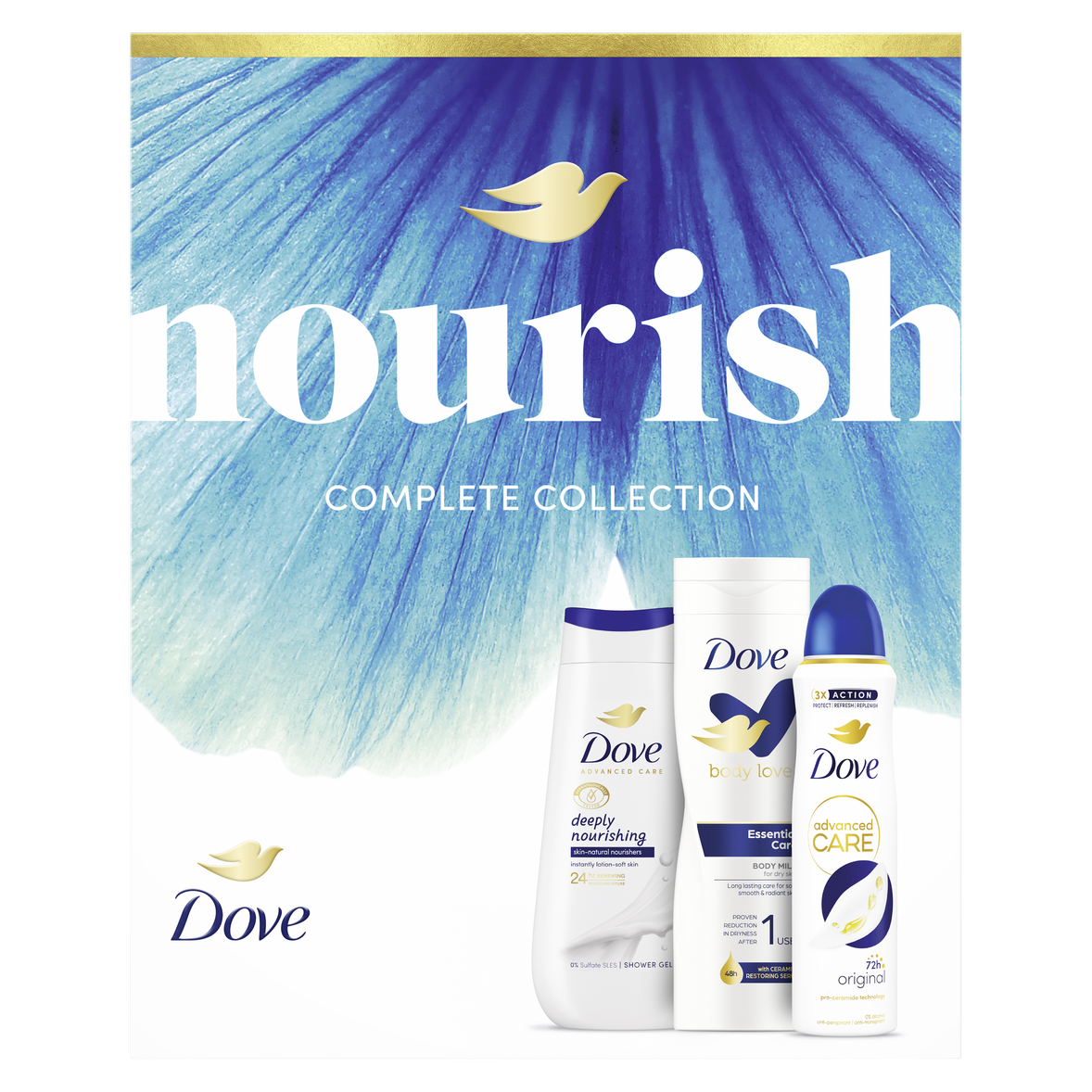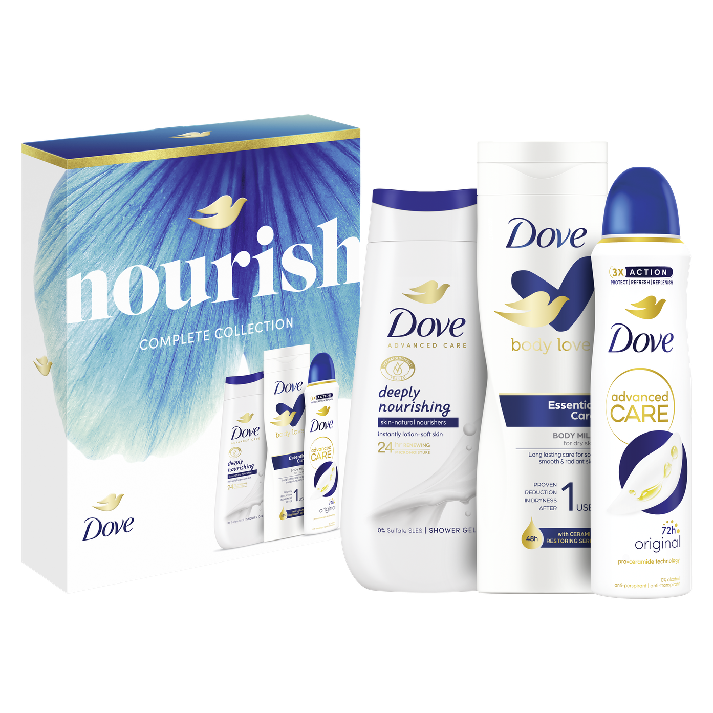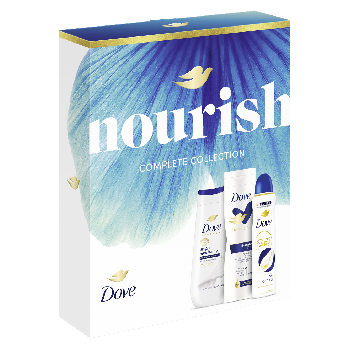 Hledáte ten pravý dárek pro Vaši blízkou osobu? Vsaďte na jistotu. Připravili jsme pro vás dárek plný jemnosti a péče pro pokožku. Přesně to je vánoční balíček Dove Original, který obsahuje oblíbený sprchový gel, antiperspirant sprej a tělové mléko. Sprchový gel Dove Advanced Care Deeply Nourishing je obohacen o novou patentovanou technologií 24h Renewing MicroMoisture, která rozkládá olejové kapky na miliony mikrokapek pro lepší výživu pokožky. Výsledkem je vyživená a zdravě vypadající pokožka po celý den. Získejte pocit hydratované pokožky jako po použití tělového mléka. S jemnou pudrovou vůní ikonickou pro Dove. Antiperspirant Dove Advanced Care vám poskytne 72hodinovou ochranu před potem a zápachem, stejně jako hladké a hydratované podpaží. Připravte se na to, abyste se mohla cítit sebejistě. Naše tělové mléko rozmazluje vaši pokožku bohatou péčí po dobu až 48 hodin a rychle se vstřebává. Obsahuje také naše Ceramide Build-Up Serum, jedinečnou kombinaci přísad, které pomáhají vaší pokožce vytvářet esenciální ceramidy, které posilují bariéru pokožky a zachovávají její přirozenou hydrataci. To pravé pro pocit jemné a pružné pokožky - každý den.