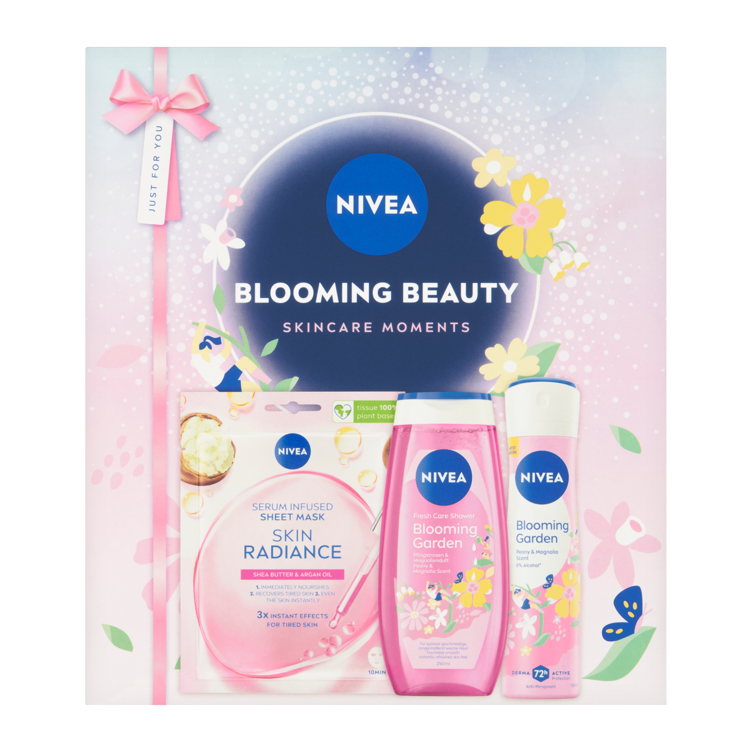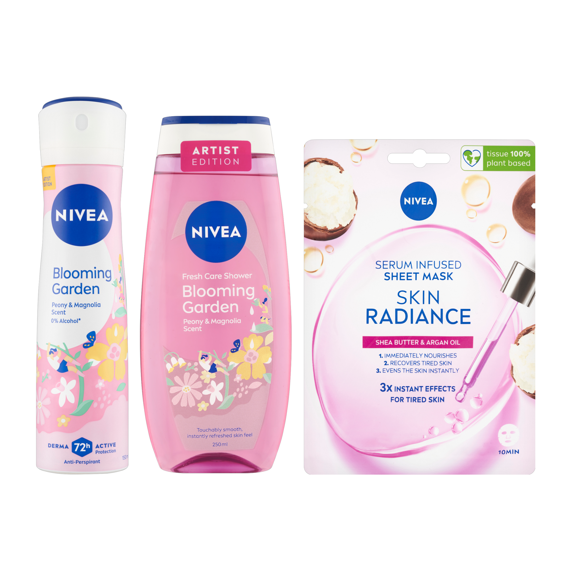 NIVEA Sprchový gel Blooming Garden 250ml: Aqua, Sodium Laureth Sulfate, Cocamidopropyl Betaine, Sodium Chloride, Decyl Glucoside, Parfum, Sodium Ascorbyl Phosphate, Tocopherol, Glycerin, Citric Acid, Sodium Benzoate, CI 16035 Nivea Sprej AP Blooming Garden LE: Butane, Isobutane, Propane, Isopropyl Palmitate, Aluminum Chlorohydrate, Dicaprylyl Ether,Caprylic/Capric Triglyceride, Hydrolyzed Pearl, Octyldodecanol, Persea Gratissima Oil, DisteardimoniumHectorite, Propylene Carbonate, Tocopherol, Glycerin, Aqua, Sorbic Acid, Potassium Sorbate, TetramethylAcetyloctahydronaphthalenes, Linalool, Benzyl Salicylate, Linalyl Acetate, Benzyl Alcohol, JuniperusVirginiana Oil, Trimethylcyclopentenyl Methylisopentenol, Benzaldehyde, Rose Ketones, Parfum NIVEA Rozjasňující textilní maska: Aqua, Butylene Glycol, Propanediol, Butyrospermum Parkii Butter, Argania Spinosa Kernel Oil, Sodium Hyaluronate, Hydrolyzed Sodium Hyaluronate, Vitis Vinifera Seed Oil, Magnolia Officinalis Bark Extract, Chondrus Crispus Extract, Lithothamnion Calcareum Extract, Allantoin, Betaine, Xanthan Gum, Polyglyceryl-10 Laurate, Xylitylglucoside, Hydroxyethylcellulose, Arginine, Anhydroxylitol, Saccharide Isomerate, Phytic Acid, Xylitol, Sodium Polyglutamate, Citric Acid, Sodium Citrate, 1,2-Hexanediol, Hydroxyacetophenone, Phenoxyethanol, Parfum