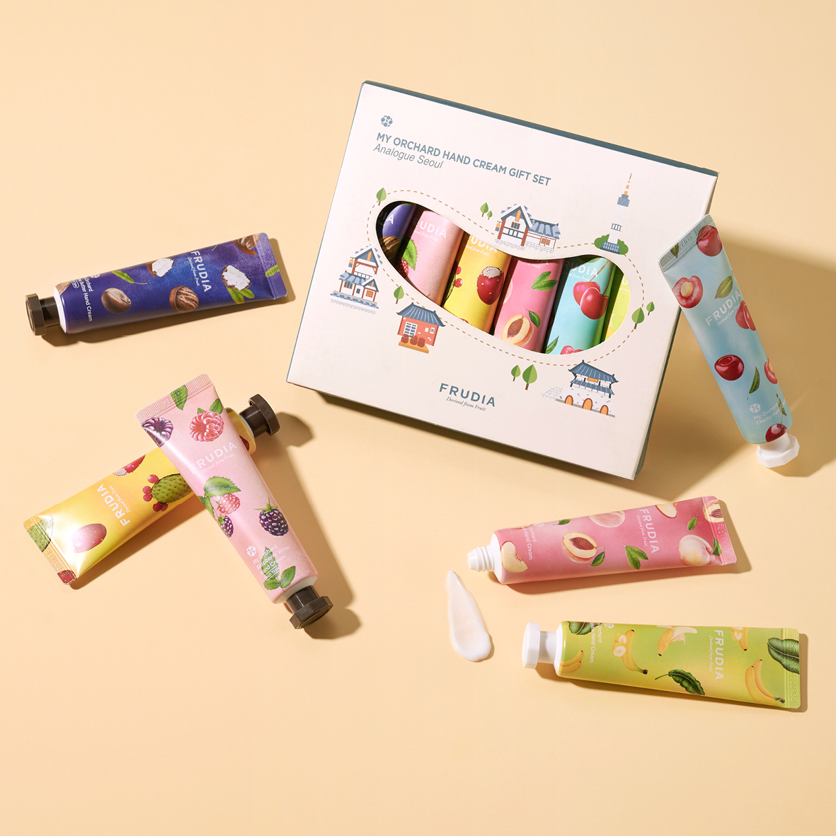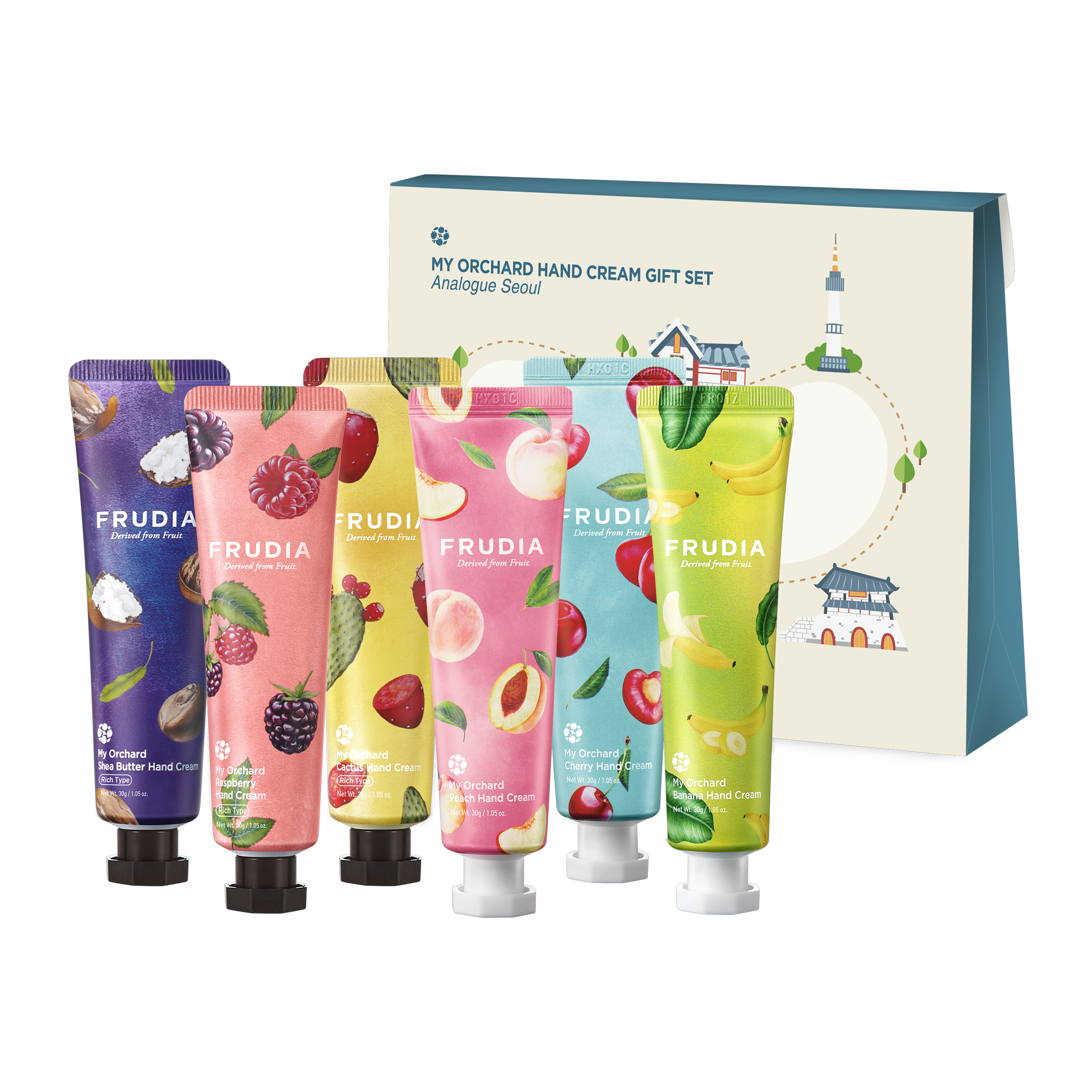 Frudia My Orchard Shea Butter Hand Cream 30g: Water(Aqua), Glycerin, Cetearyl Alcohol, Isopropyl Myristate, Dimethicone, Polysorbate 60, Mineral Oil(Paraffinum Liquidum), Glyceryl Stearate, Adenosine, Butyrospermum Parkii (Shea) Butter, Erythritol, Squalane, Punica Granatum Fruit Extract, Prunus Armeniaca (Apricot) Kernel Oil, Vitis Vinifera (Grape) Seed Oil, Panthenol, Centella Asiatica Extract, Honey Extract, Citrus Paradisi (Grapefruit) Seed Oil, Mangifera Indica (Mango) Seed Oil, Punica Granatum Seed Oil, Solanum Lycopersicum (Tomato) Seed Oil, Sodium Polyacrylate, Sorbitan Sesquioleate, Ethylhexyl Stearate, Palmitic Acid, Stearic Acid, Trideceth-6, C11-13 Isoalkane, Coco-Caprylate/Caprate, Butylene Glycol, Tocopherol, PEG-100 Stearate, Disodium EDTA, Phenoxyethanol, Chlorphenesin, 1,2-Hexanediol, Fragrance(Parfum), Coumarin, Alpha-Isomethyl Ionone, Citronellol, Hydroxycitronellal.