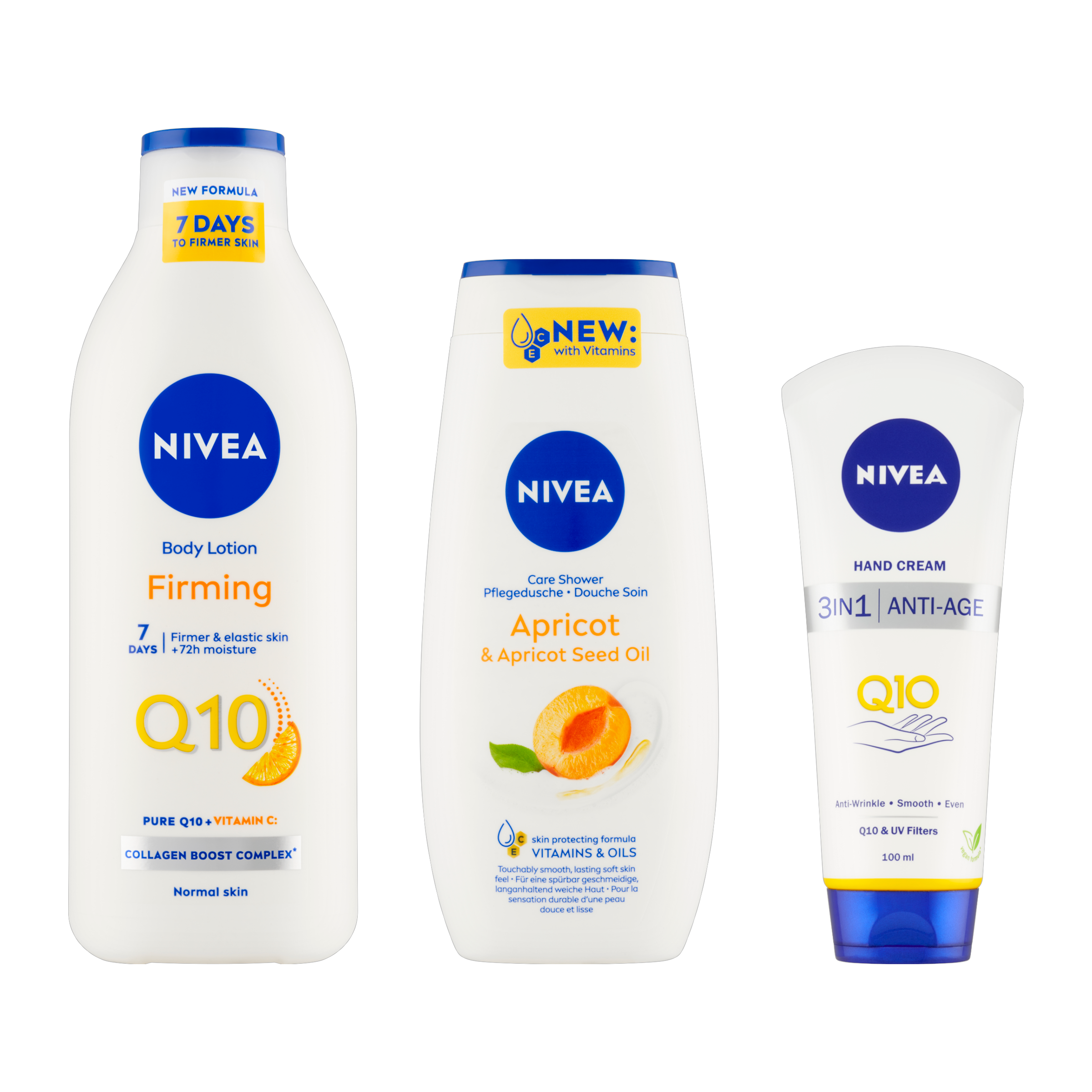 Nivea Krém na ruce Anti Age Q10: Aqua, Glycerin, Octyldodecanol, Cetyl Alcohol, Octocrylene, Stearyl Alcohol, Glyceryl Stearate SE, Hydrogenated Coco-Glycerides, Creatine, 1-Methylhydantoin-2-Imide, Ubiquinone, Butyrospermum Parkii Butter, Dimethicone, Butyl Methoxydibenzoylmethane, Acrylates/C10-30 Alkyl Acrylate Crosspolymer, Carbomer, Sodium Cetearyl Sulfate, Sodium Hydroxide, Ethylhexylglycerin, Phenoxyethanol, Trisodium EDTA, Linalool, Citronellol, Hexyl Cinnamal, Benzyl Alcohol, Alpha-Isomethyl Ionone, Limonene, Eugenol, Parfum Nivea Sprchový gel Apricot 250ml: Aqua, Sodium Laureth Sulfate, Cocamidopropyl Betaine, Coco-Glucoside, Parfum, Prunus Armeniaca Kernel Oil, Vitis Vinifera Seed Oil, Sodium Ascorbyl Phosphate, Tocopherol, Glycerin, Glycol Distearate, Citric Acid, Sodium Chloride, Hydrogenated Castor Oil, Sodium Benzoate, Benzoic Acid, Limonene, Linalool, Geraniol Nivea Zpevňující tělové mléko Q10 400ml: Aqua, Glycerin, Isopropyl Palmitate, Alcohol Denat., Glyceryl Stearate SE, Glyceryl Stearate, C12-15 Alkyl Benzoate, Ubiquinone, Sodium Ascorbyl Phosphate, Butyrospermum Parkii Butter, Dimethicone, Sodium Cetearyl Sulfate, Carbomer, Sodium Hydroxide, Trisodium EDTA, Phenoxyethanol, Ethylhexylglycerin, Linalool, Citronellol, Benzyl Alcohol, Alpha-Isomethyl Ionone, Linalyl Acetate, Citrus Aurantium Peel Oil, Limonene, Eugenyl Acetate, Parfum