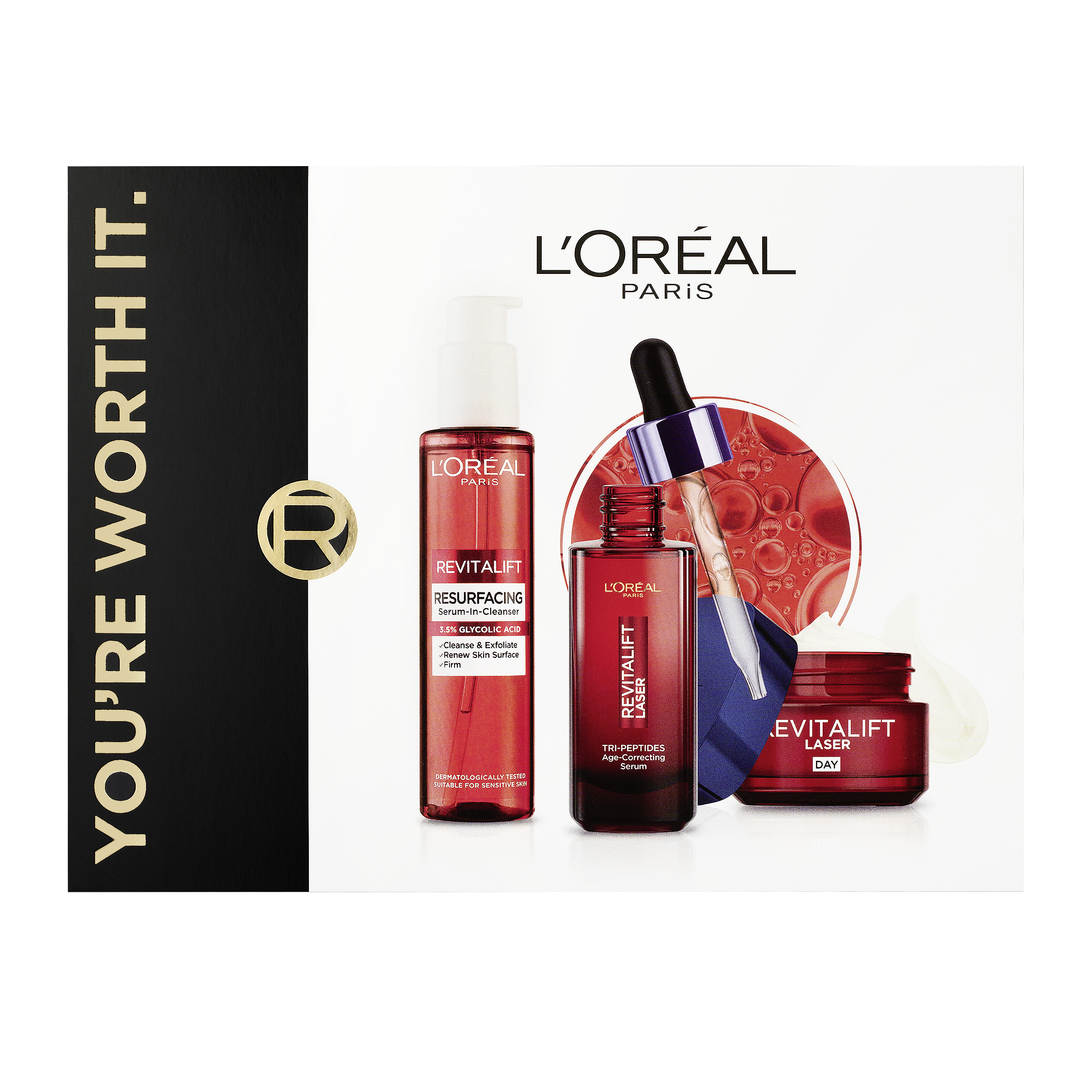 Objevte sílu tripeptidů! Nový dárkový balíček L'Oréal Paris Revitalift Laser obsahuje exfoliační čisticí gel pro hebkou a zpevněnou pokožku s 3,5 % kyseliny glykolové, která pomáhá odstranit odumřelé kožní buňky a vyhladit povrch pleti. Tripeptidové sérum, které kombinuje sílu 3 aktivních složek v jednom produktu pro účinnou a viditelnou redukci vrásek za pouhé 2 týdny. A denní krém proti vráskám s trojím účinkem s pro-retinolem + kyselinou hyaluronovou + vitaminem C* + peptidem Argireline®.*Vitamin Cg