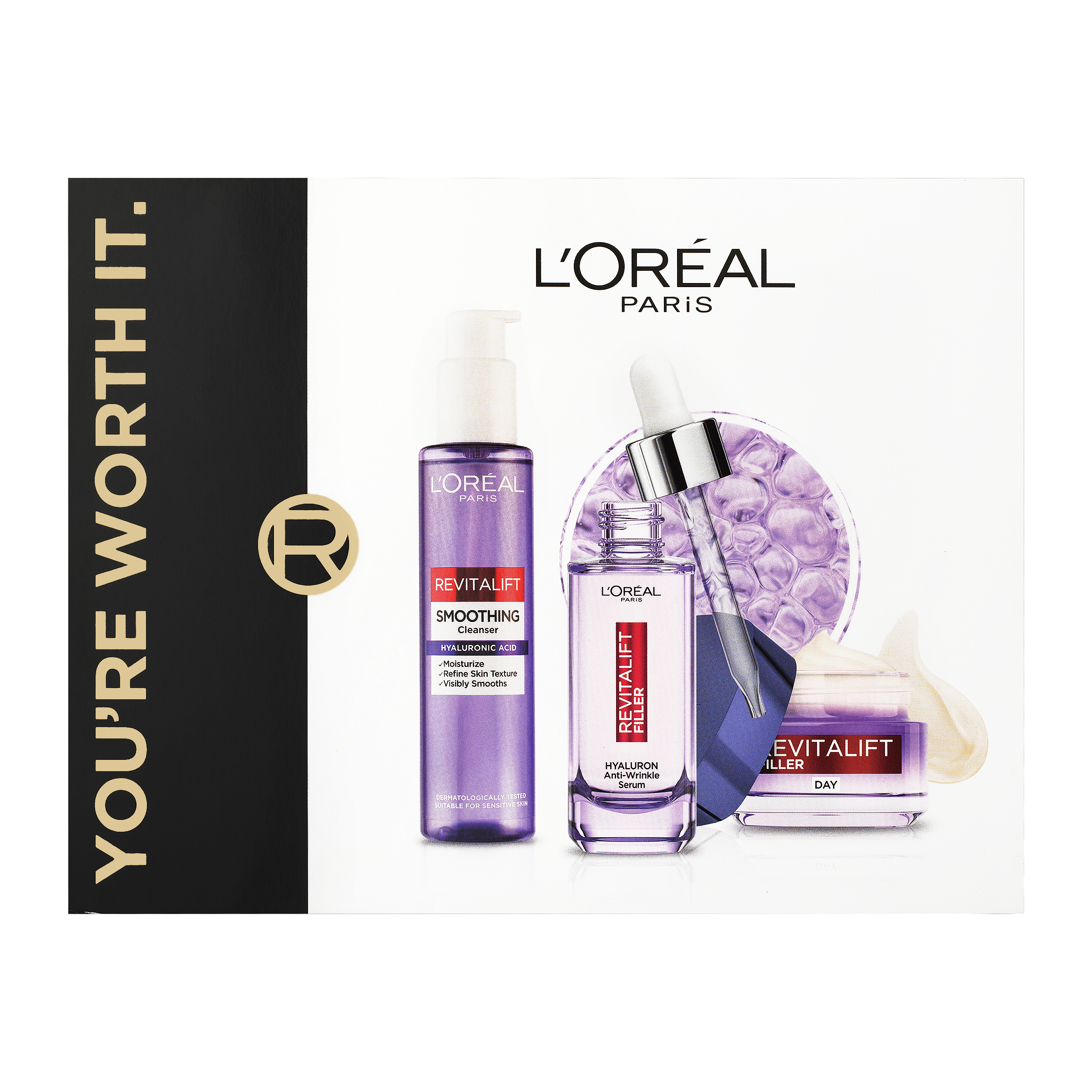 L'Oréal Paris Revitalift Filler je nyní k dispozici v dárkovém balení. Dopřejte své pleti potřebnou hydrataci díky vyhlazujícímu čisticímu gelu s kyselinou hyaluronovou, která pomáhá pleť hydratovat a dodává jí hladší a plnější vzhled. V balíčku také najdete sérum proti vráskám s 1,5 % čisté kyseliny hyaluronové ve třech formách pro co nejlepší proniknutí do pleti, hloubkovou hydrataci a vyplnění jemných vrásek. A vyplňující denní krém s s kyselinou hyaluronovouCX s dlouhodobým účinkem, který vyplňuje pleť a vyhlazuje vrásky.
