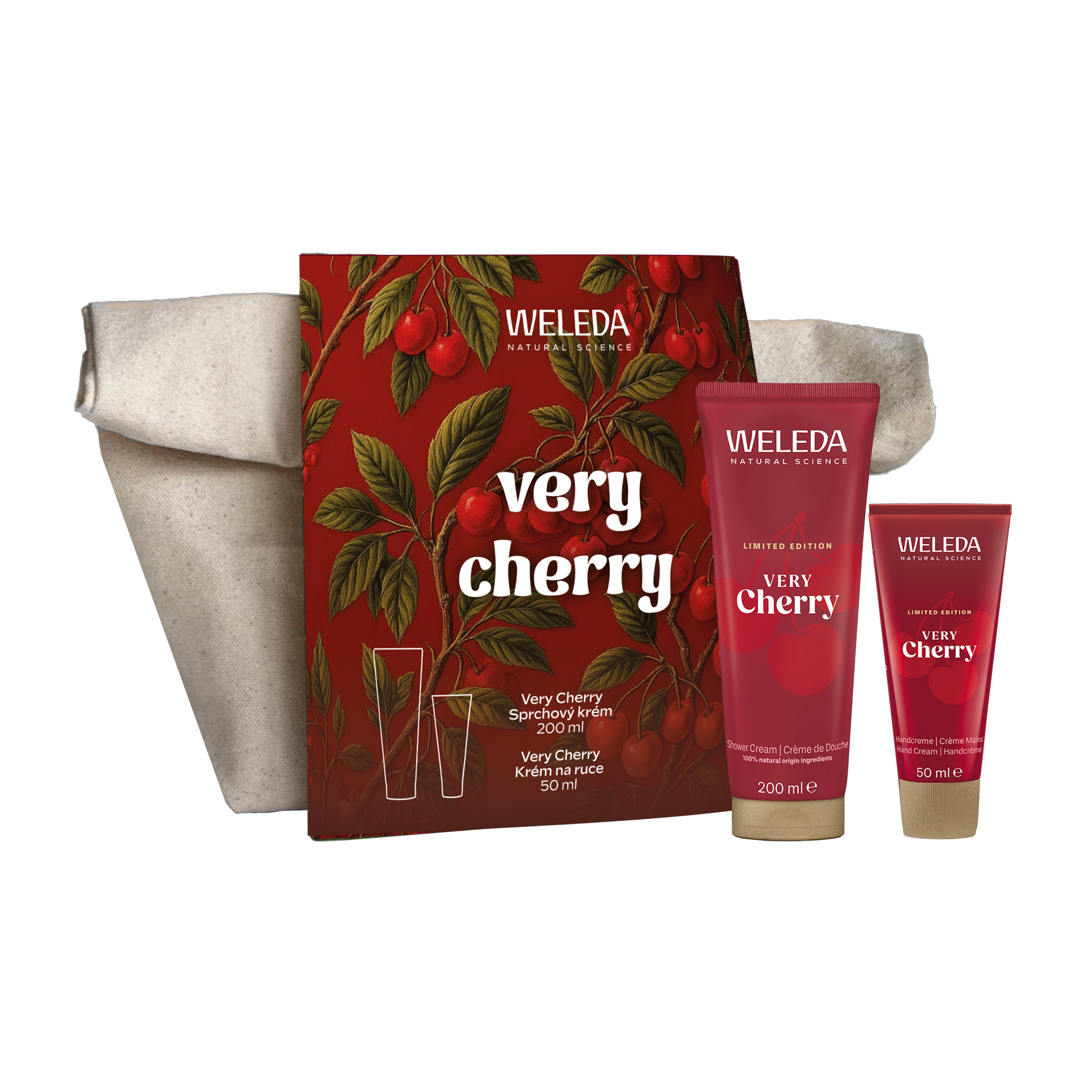 Vánoční balíček obsahuje sprchový krém Very Cherry Weleda (200 ml) a krém na ruce Very Cherry Weleda (50 ml) v decentní bavlněné taštičce.