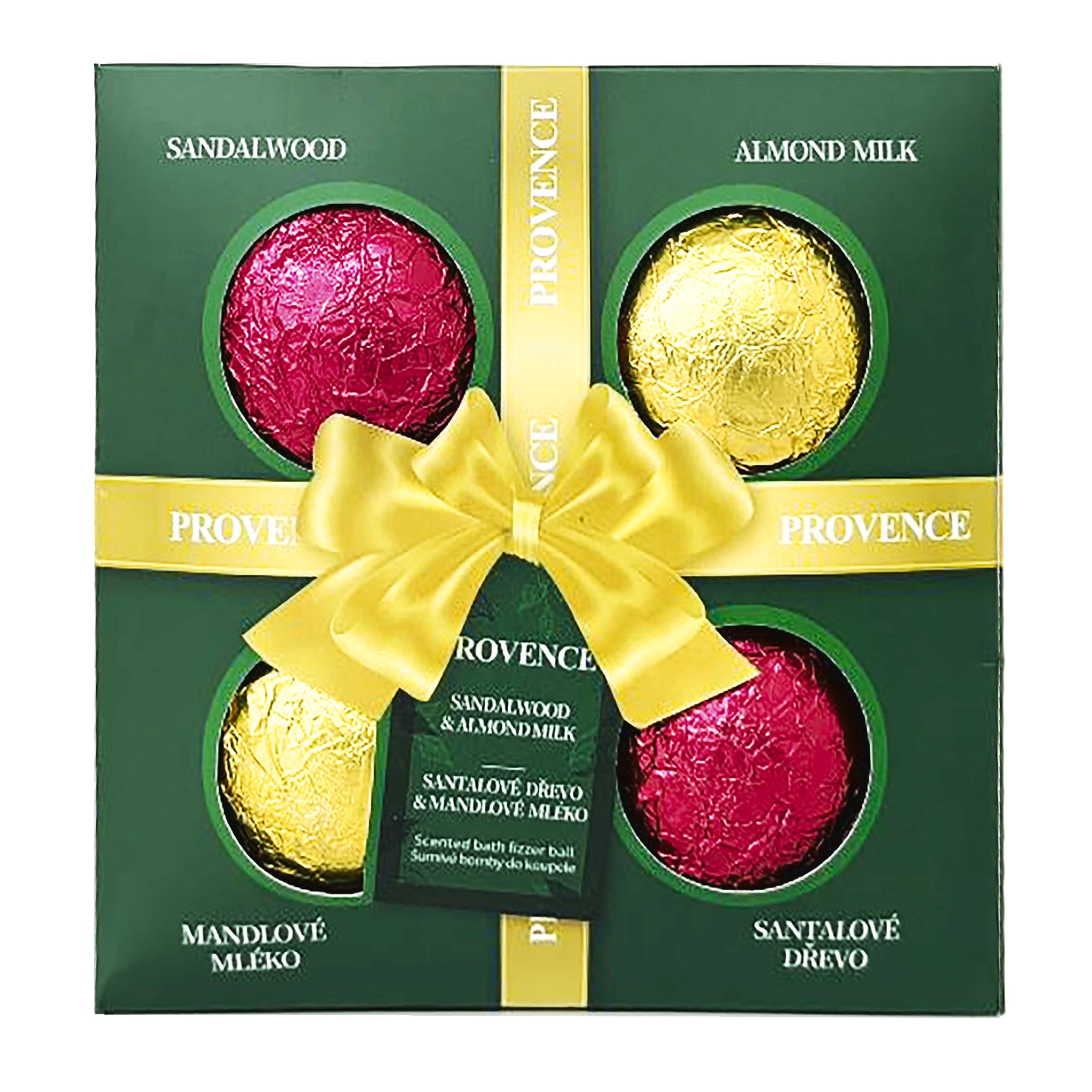 Dárková sada šumivých bomb do koupele Provence. Balení obsahuje 4 krásně zabalené bomby ve dvou oblíbených vůních: santalové dřevo a mandlové mléko. Hmotnost jedné bomby: 90 g