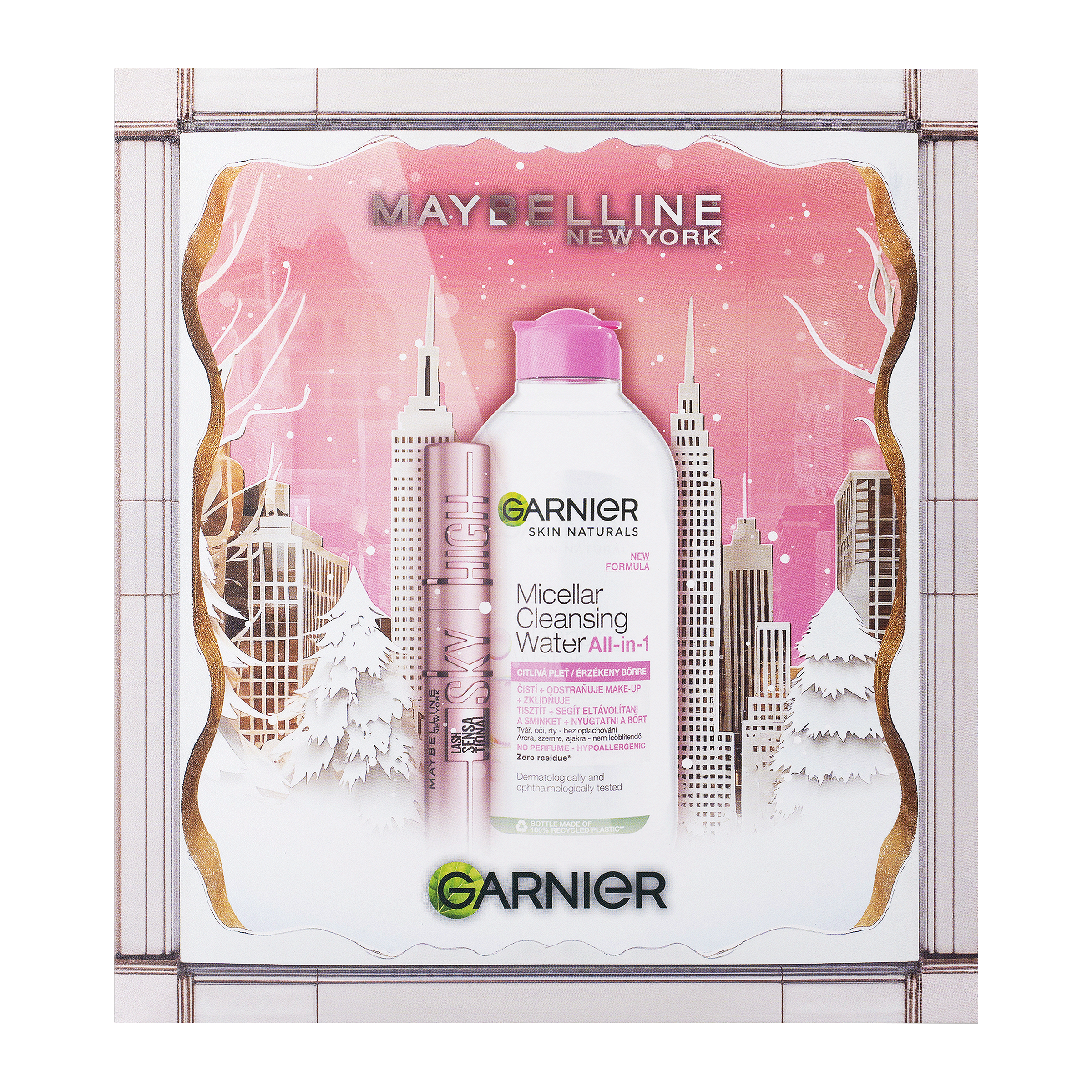 Vánoční balíček značky Maybelline NY ve spojení s Garnier je ideální volbou pro každou dívku, která se zajímá o trendy v líčení a péči o pleť. Obsah balíčku: Prodlužující řasenka Sky high, která je hitem internetu. Tvoje řasy prodlouží až do nebe, dokonale natočí a precizně oddělý každou řasu. Garnier micelární voda pro citlivou pleť. Micelární voda pečlivě odstraní veškeré nečistoty z pleti a zajistí pocit její 100% svěžesti.