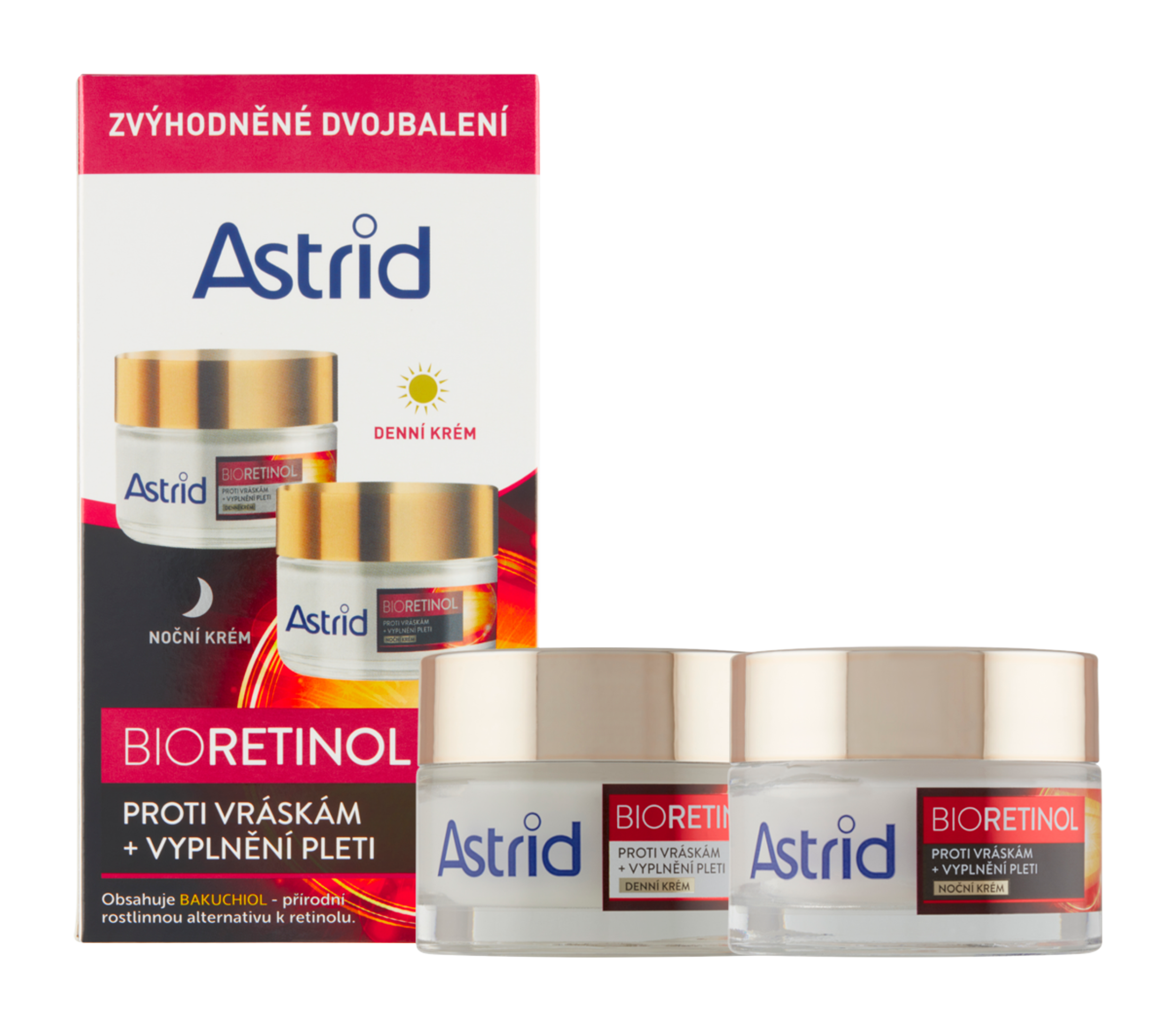 ASTRID BIORETINOL Pokročilý denní krém proti vráskám účinně hydratuje, příjemně vypíná a zpevňuje zralou pleť. Zlepšuje její pružnost a viditelně redukuje počet a velikost vrásek. Obohacený o komplex vitamínů B5, B3, C E, který pomáhá pleť posílit, zmírnit nežádoucí pigmentaci, sjednotit její tón a podpořit její přirozený jas.