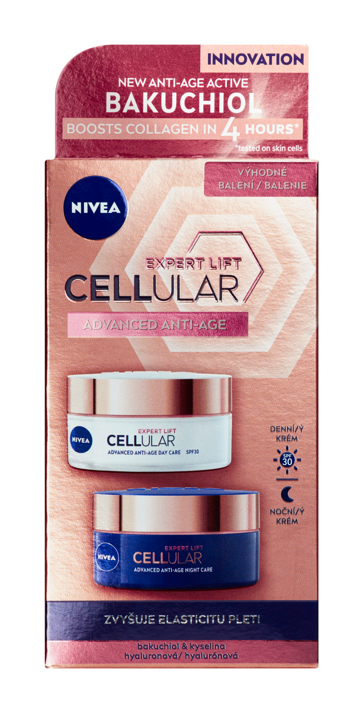 Nivea® Denní krém Cellular Expert Lift OF 30 Čistý bakuchiol: již 4 hodiny po nanesení zvyšuje tvorbu kolagenu v pleťových buňkách a pomáhá obnovit pleť.* Mikro & makro kyselina hyaluronová, známá pro své hydratační účinky, vyhlazuje a viditelně redukuje vrásky. OF 30 pomáhá chránit plet před stárnutím vlivem slunečního záření, vznikem pigmentových skvrn a pomáhá navrátit elasticitu povolené pleti. Výsledek: 1 týden: Pleť je pevnější, pružnější a kontury obličeje jsou viditelně remodelovány. 2 týdny: Hluboké vrásky jsou znatelně redukovány. Pleť vypadá mladší, je sjednocená a pružnější. 4 týdny: Kvalita pleti je zlepšená. Díky posílení kožní bariéry může pleť bojovat proti budoucím známkám stárnutí.