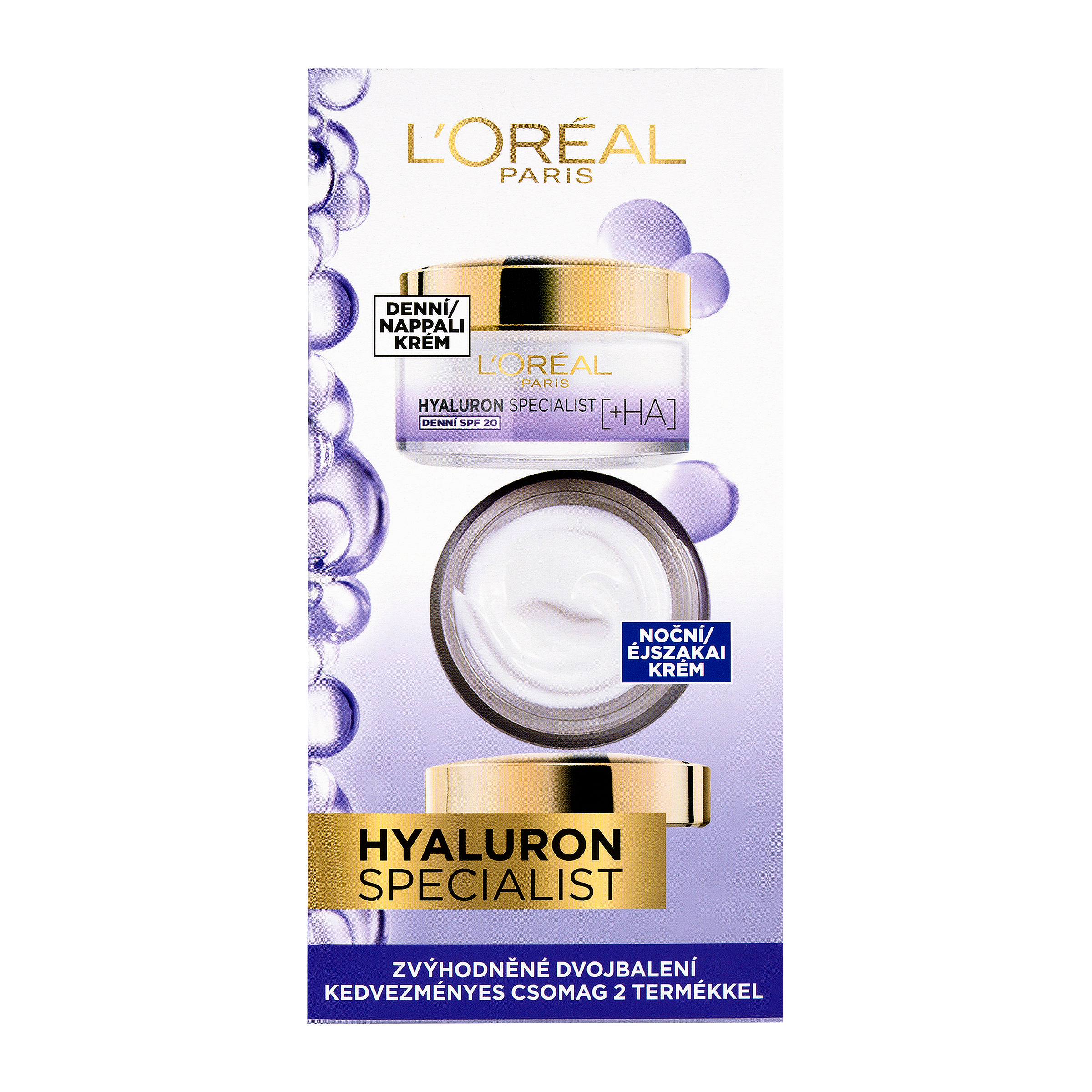 L´Oréal Paris Hyaluron Specialist Denní a noční krém s vyživující texturou obsahují dva druhy kyseliny hyaluronové. Vysokomolekulární kyselina hyaluronová se postará o povrch pokožky, zásobuje ji vlhkostí a vyhladí ji. Nízkomolekulární kyselina hyaluronová proniká do pokožky a hydratuje ji zevnitř. Pleť bude vyplněna, hydratovaná a vrásky vyhlazené. Noční pleťový krém regeneruje pokožku během noci, zatímco ten denní ji chrání před škodlivými vlivy prostředí a UV záření.