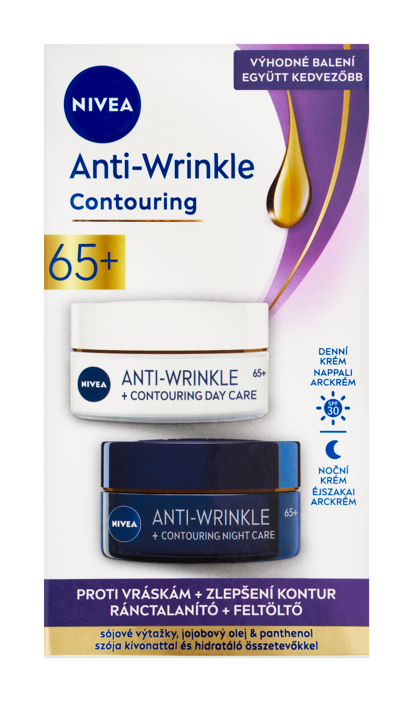 Nivea® Denní krém pro zlepšení kontur 65+ s OF 30 zlepšuje kontury zralé pleti a bojuje proti hlubokým vráskám. Složení se sójovými výtažky, hydratačními složkami a vysokou UV ochranou.