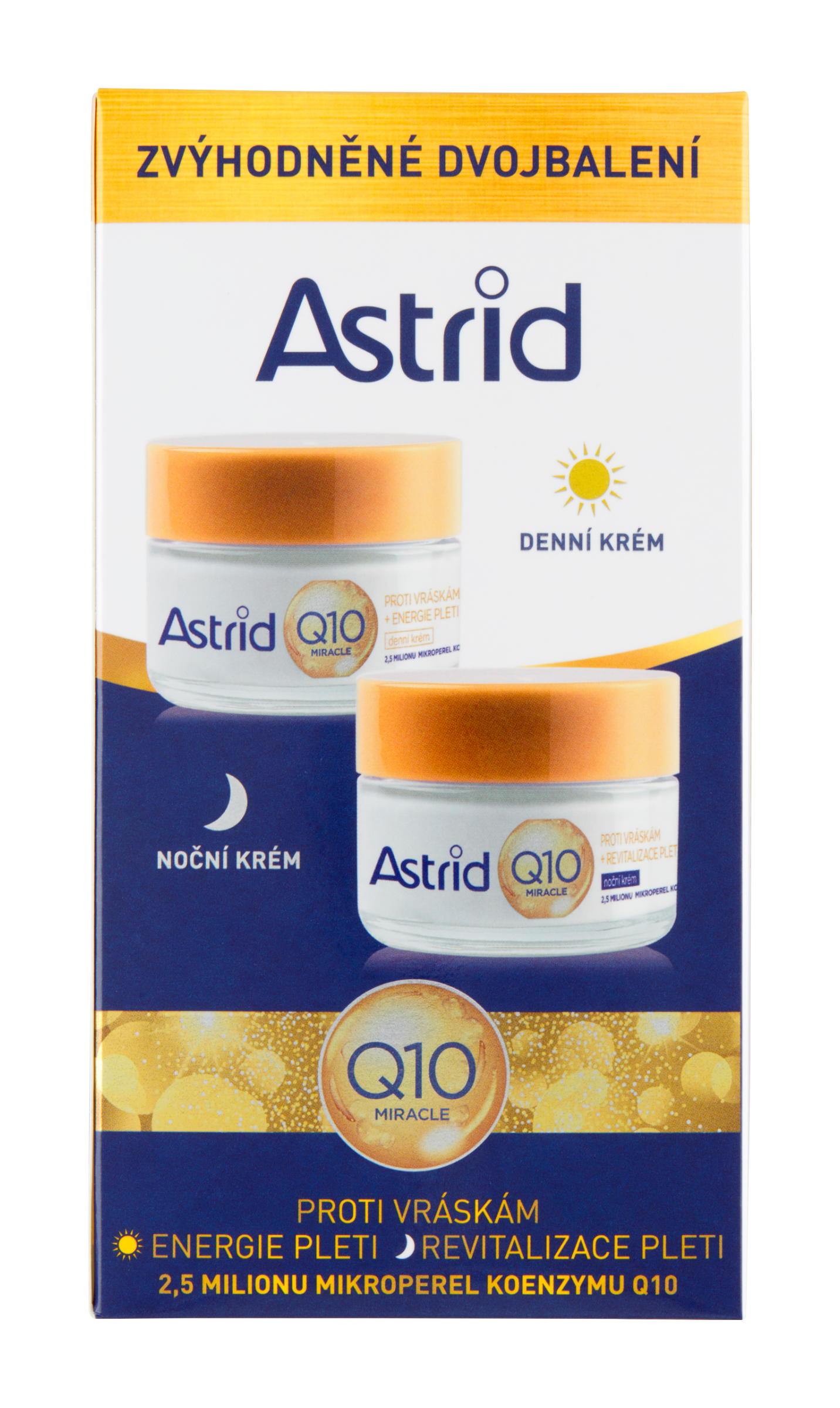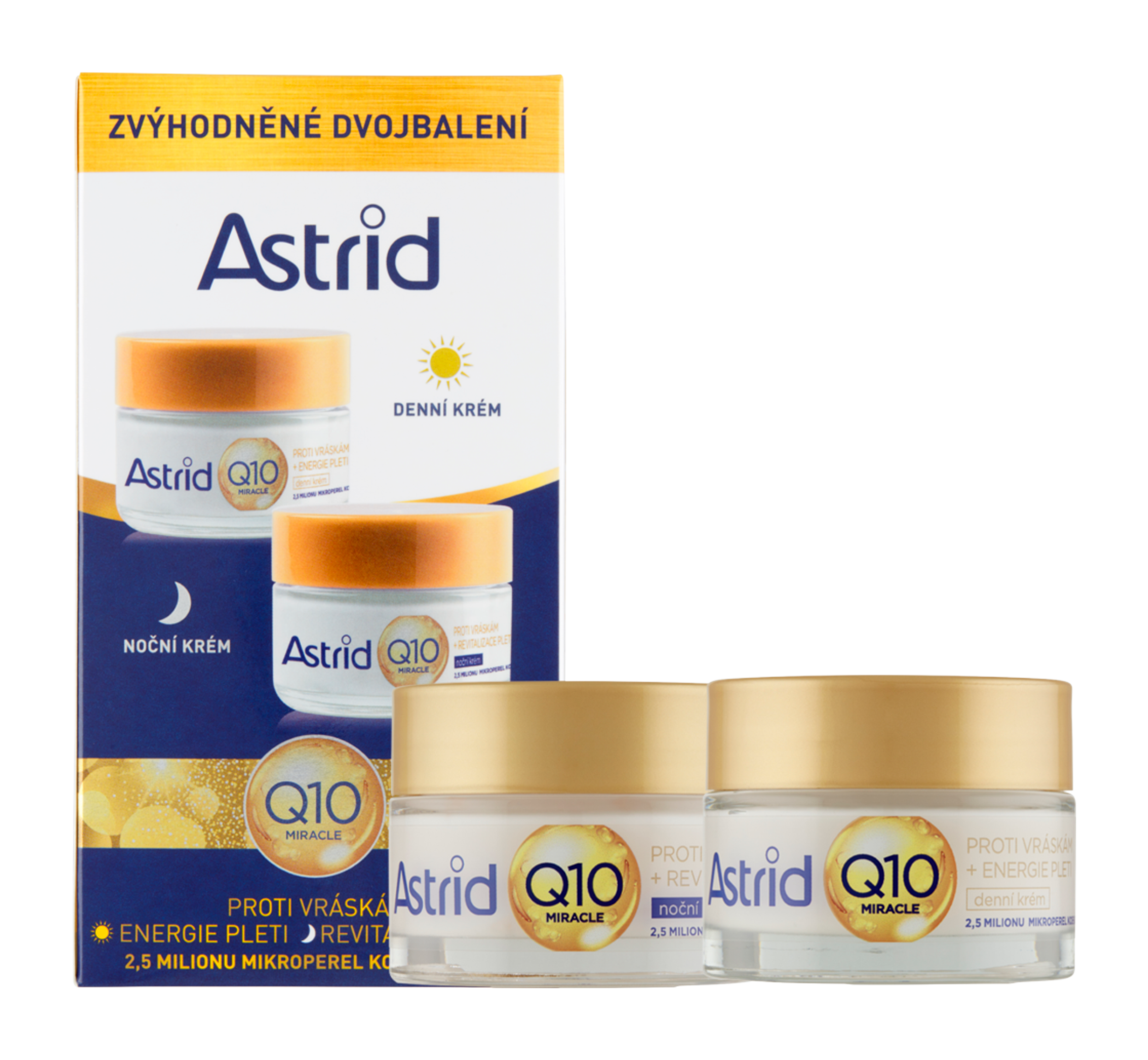 Q10 Miracle Denní krém proti vráskám pomáhá omlazovat pleť, chránit ji před předčasným stárnutím a udržovat její mladistvý vzhled. Q10 Miracle Noční krém proti vráskám pomáhá vyživovat pleť, chránit ji před předčasným stárnutím a udržovat její mladistvý vzhled. 2,5 milionu mikroperel v krému Složení obohacené o mikroperly koenzymu Q10 stimuluje produkci kolagenu, pomáhá redukovat jemné vrásky a oddalovat vznik nových. Denní krém UVA/UVB filtry chrání pleť před slunečním zářením a předčasným stárnutím.