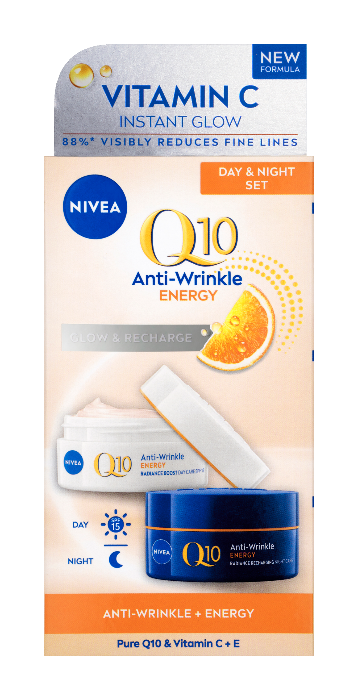 Výhodné balení denního a nočního krému Nivea Q10 Energy poskytuje vaší pleti antioxidanty a vitamíny. Rozjasňující denní krém Nivea Q10 Energy se 100% pleti identickým koenzymem Q10, vitamíny C a E a guaranou zlepšuje přirozený energetický metabolismus pleti. Díky ochrannému faktoru 15 také chrání pleť před vráskami způsobenými sluncem. Energizující noční krém Q10 Energy chrání pleť před oxidačním stresem a redukuje volné radikály. Pleť zároveň rozzáří a poskytuje jí zdravý, energizující vzhled. 88% žen potvrzuje: viditelně redukuje jemné linky (při používání Rozjasňujícího denního krému Nivea Q10 Energy, sebehodnocení, 4týdenní studie, 110 žen, 2022). 7x více vitamínu C v porovnání se standardním citronem.